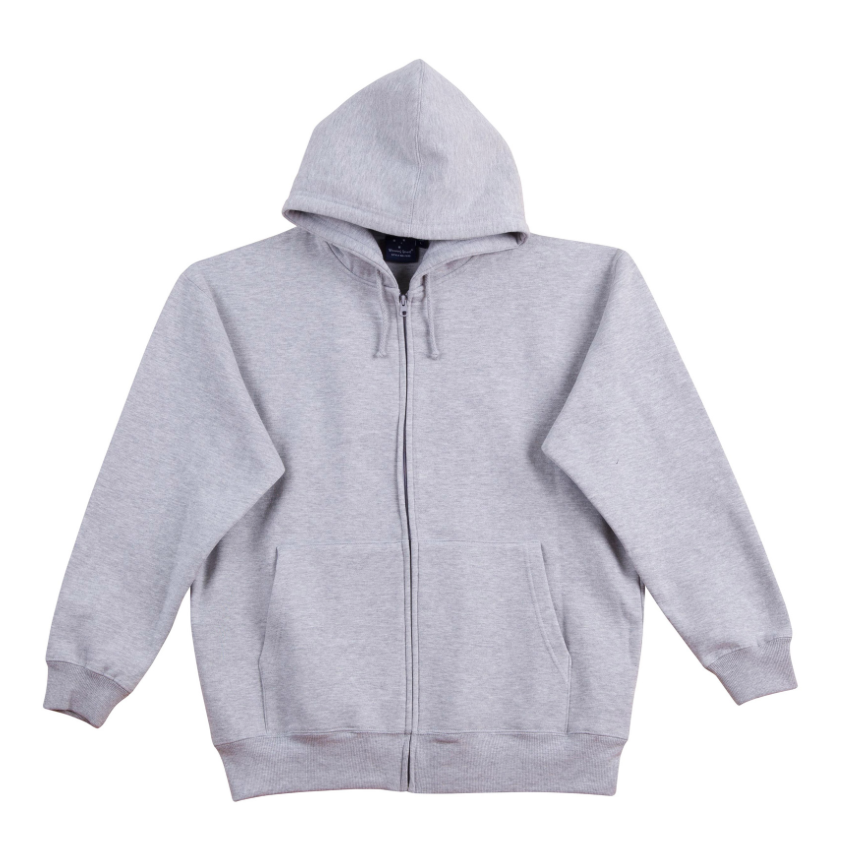 320 gsm fleecy hoodie, 80% cotton, 20% polyester. A traditional fleecy hoodie with full-zip in the centre front. Two hand warmer pockets.