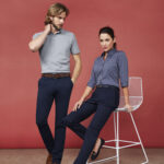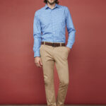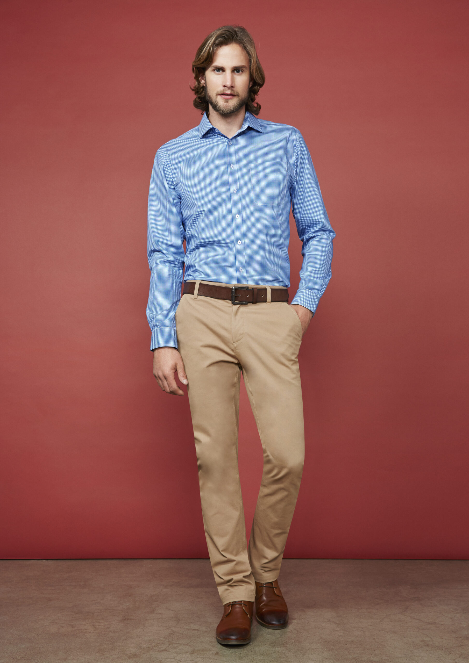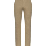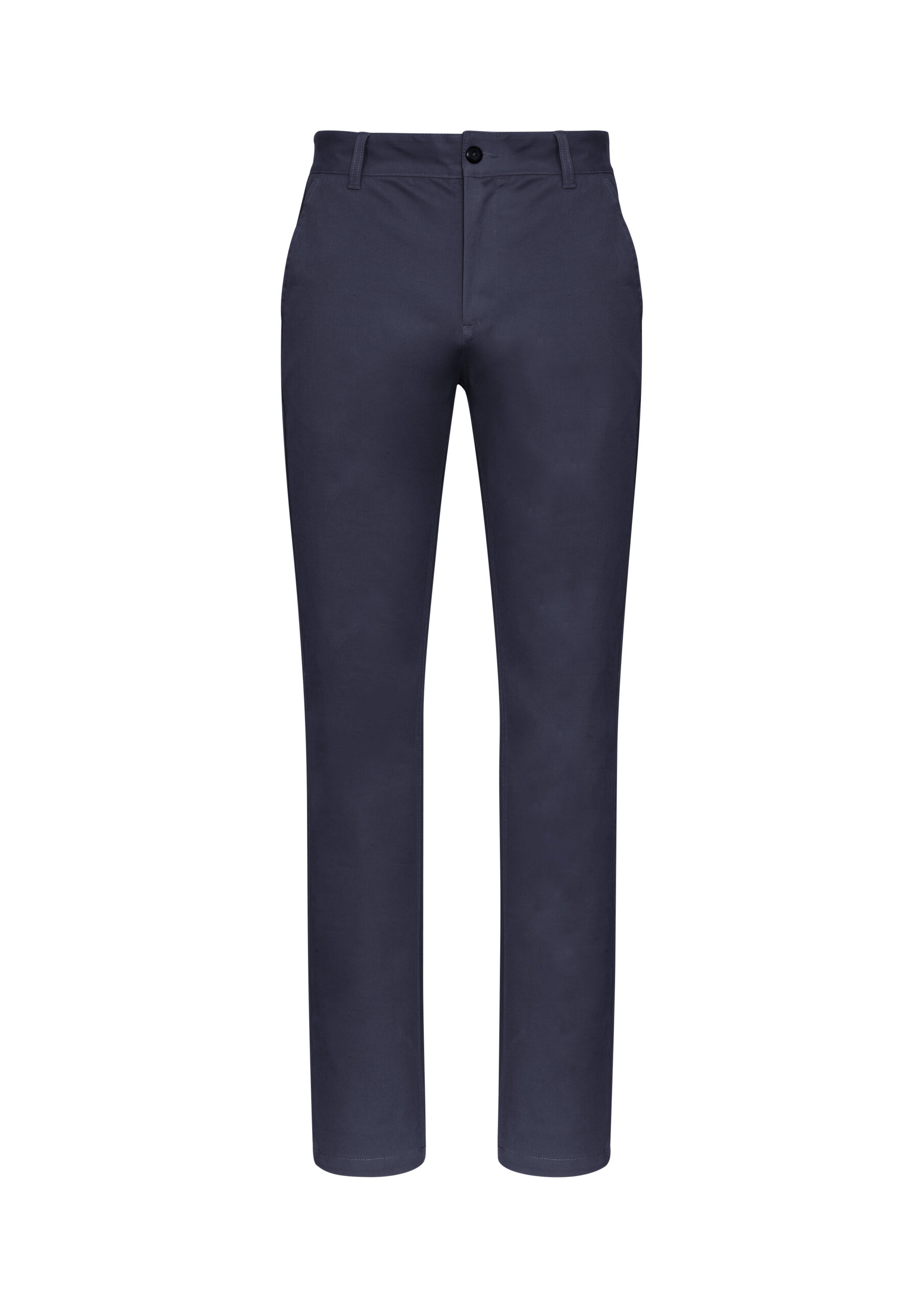 98% Cotton, 2% Elastane stretch fabric. 250 GSM, garment washed for a soft lived-in feel, comfortable modern mid-rise fit, flat front with tapered leg styling, 2 side angled pockets, 2 back welt pockets.