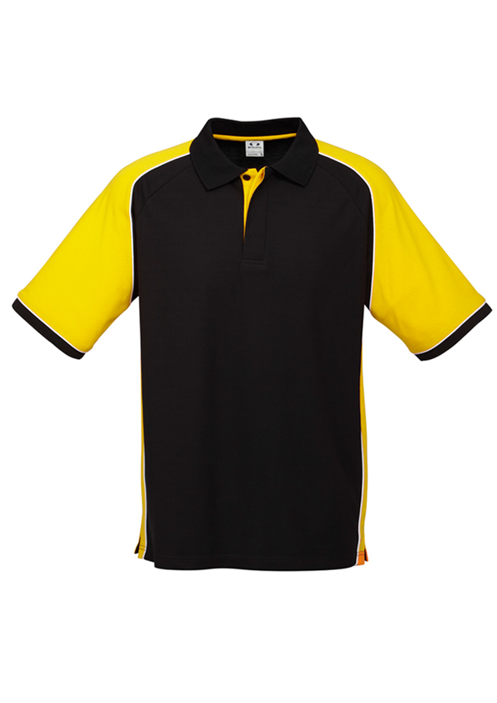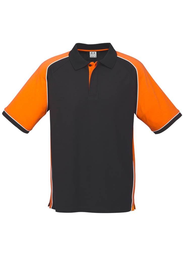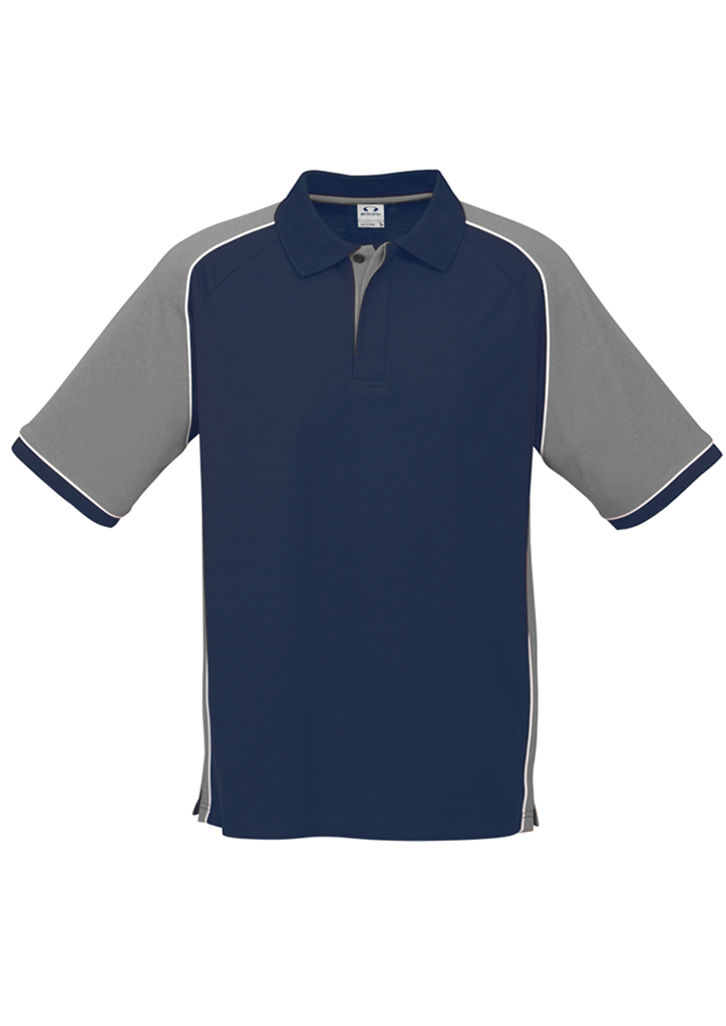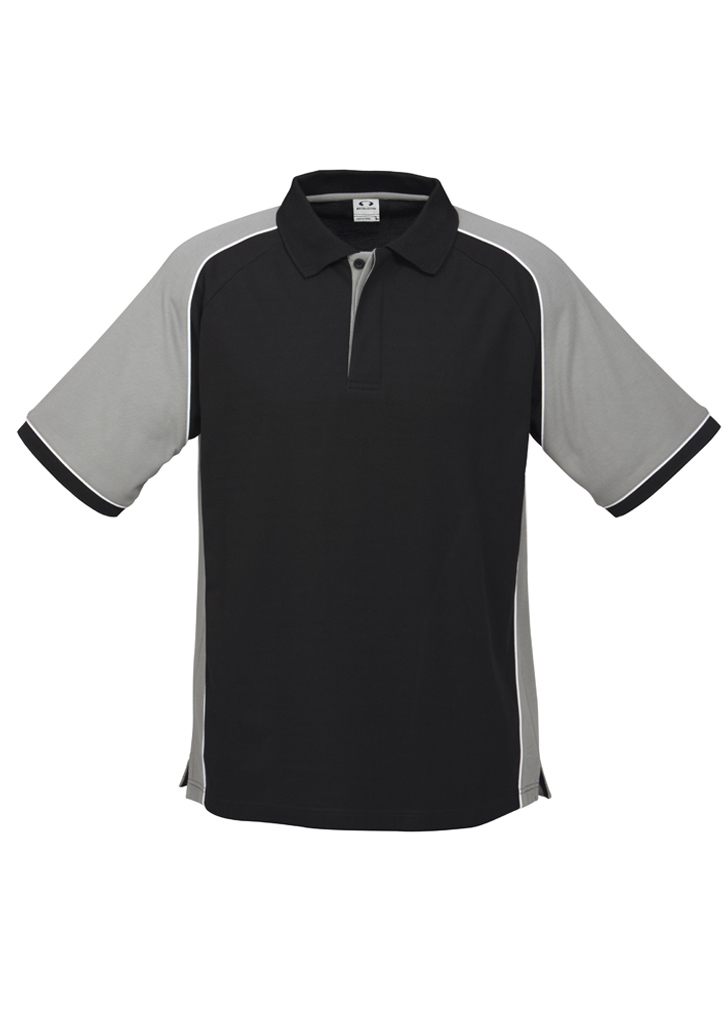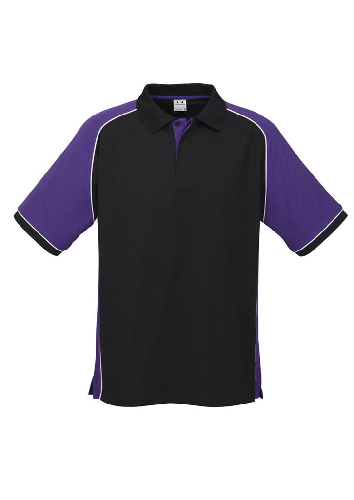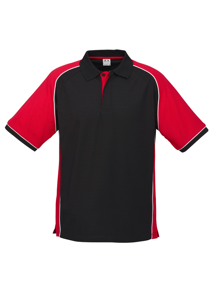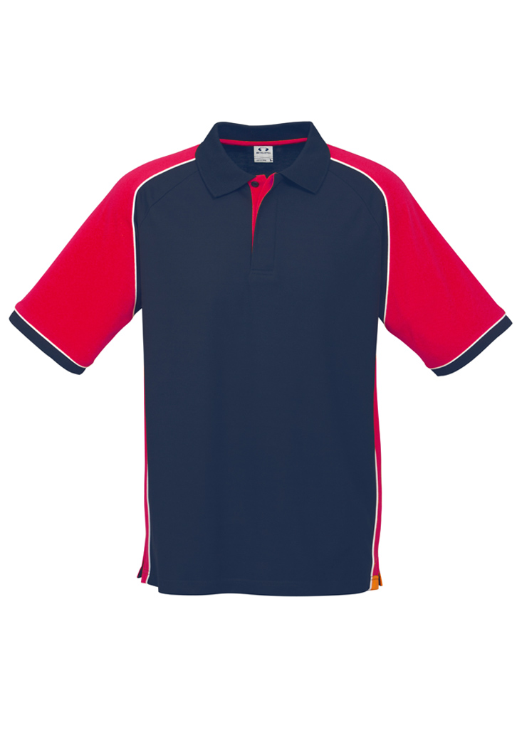65% polyester, 35% cotton pique Knit - low pill yarn. 210gsm, excellent UPF rating, contrast panel with piping, knitted collar and cuff, side splits with twill tape.