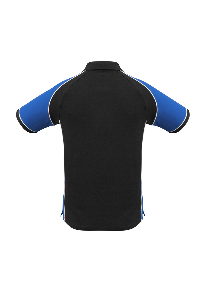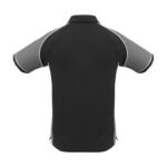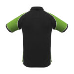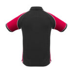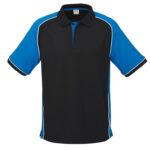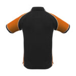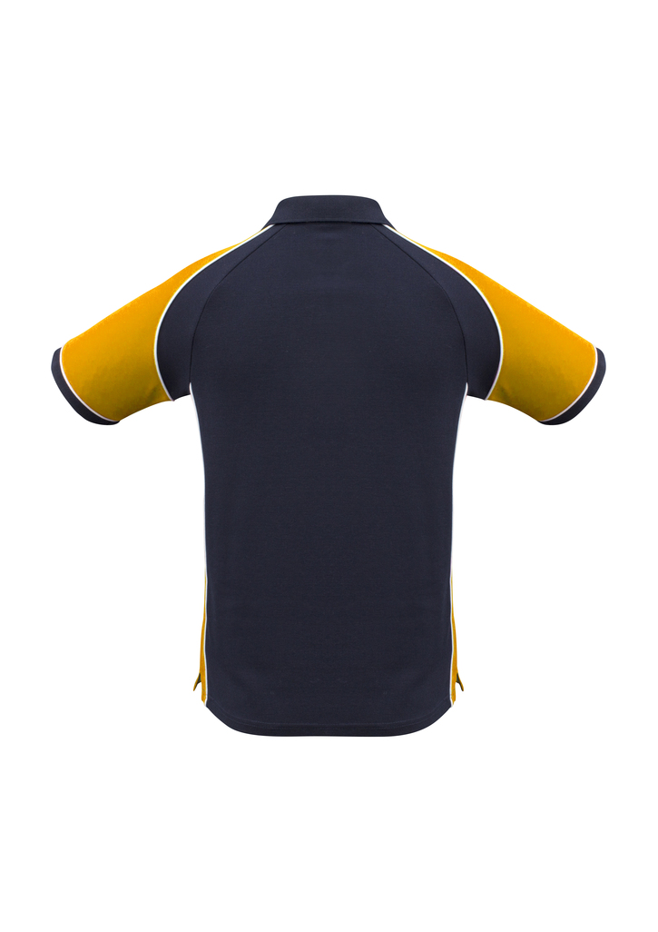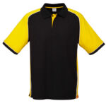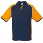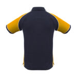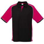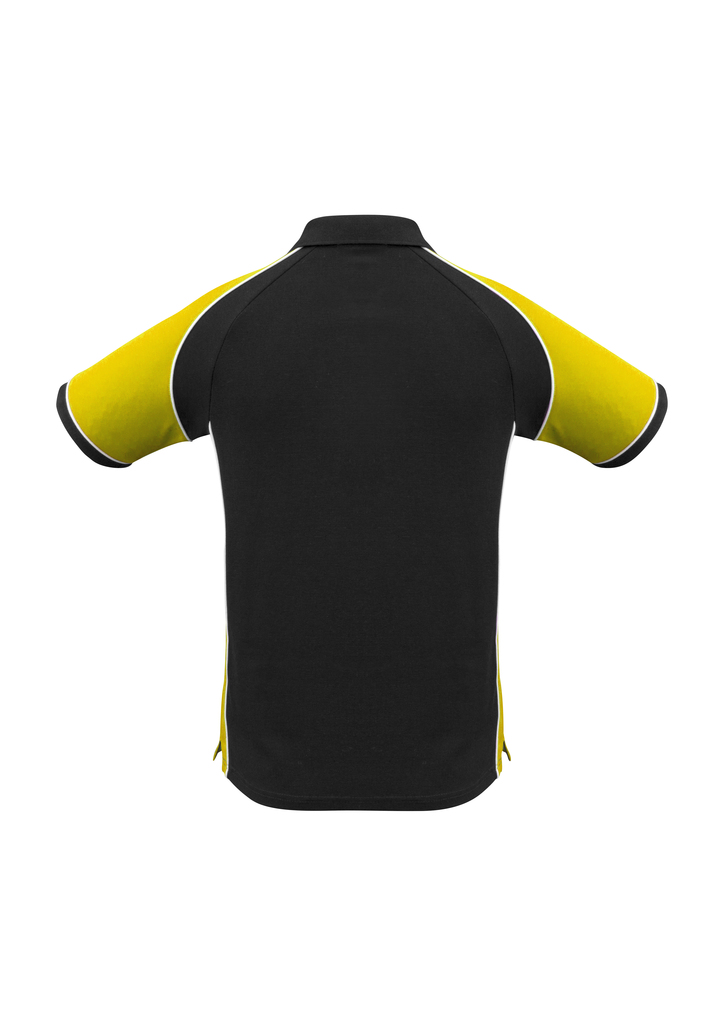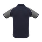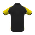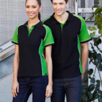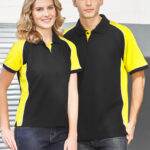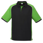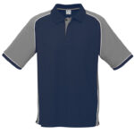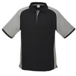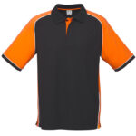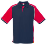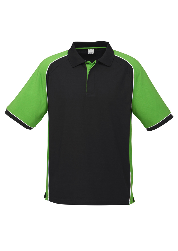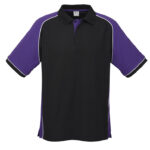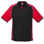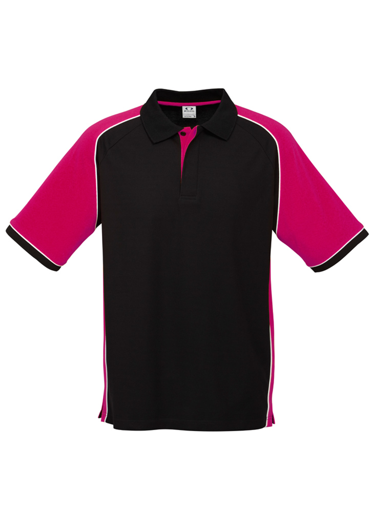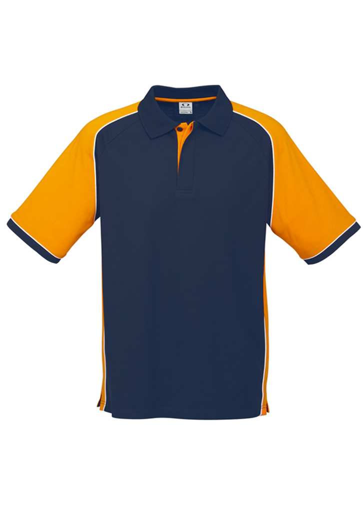 65% polyester, 35% cotton pique Knit - low pill yarn. 210gsm, excellent UPF rating, contrast panel with piping, knitted collar and cuff, side splits with twill tape.