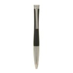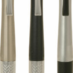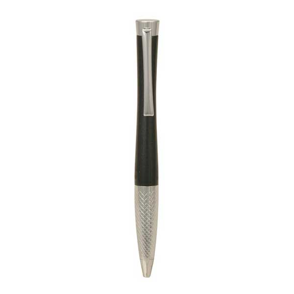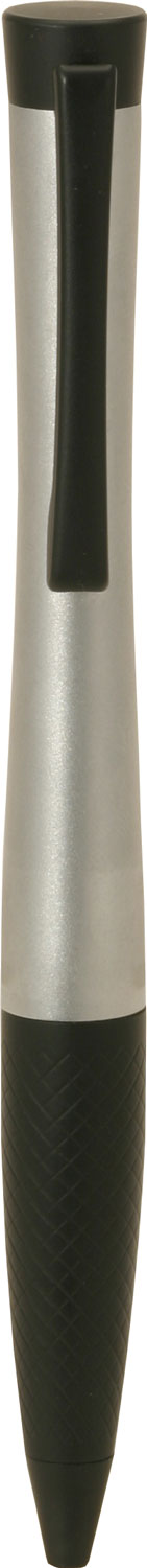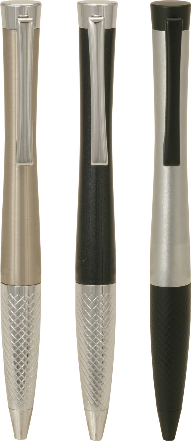 A contemporary style metal pen with coloured barrel, silver clip and contrasting silver textured grip. Parker style black refill.