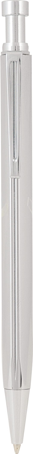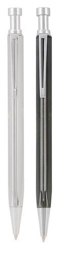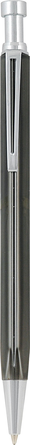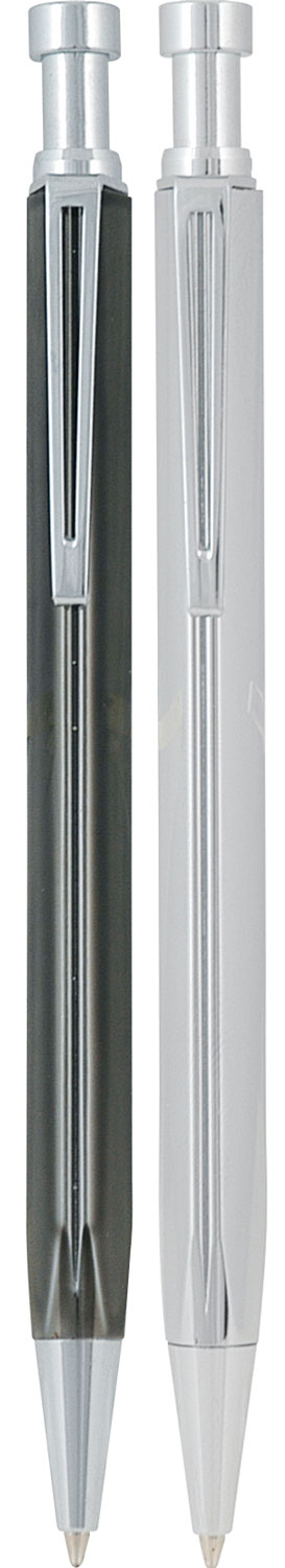 Push button metal pen with a distinctive triangular shaped barrel, which allows for branding on all three sides. Parker style black refill