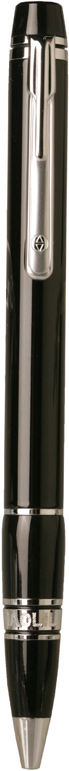 This modern style twist action pen features a gloss black barrel with chrome trim and clip. It comes with a Parker style black refill.