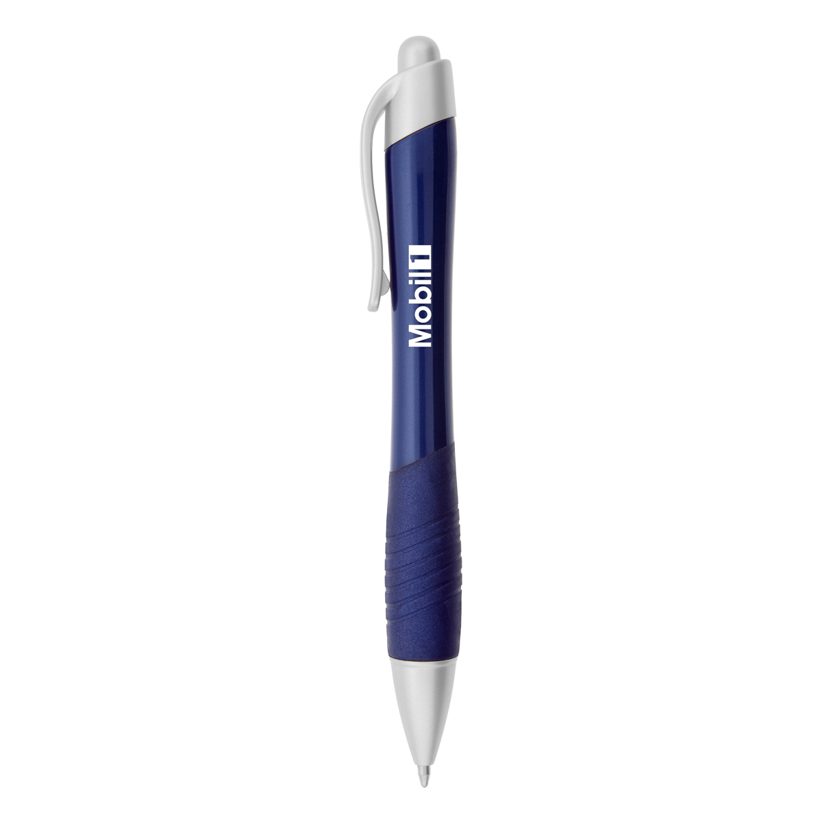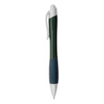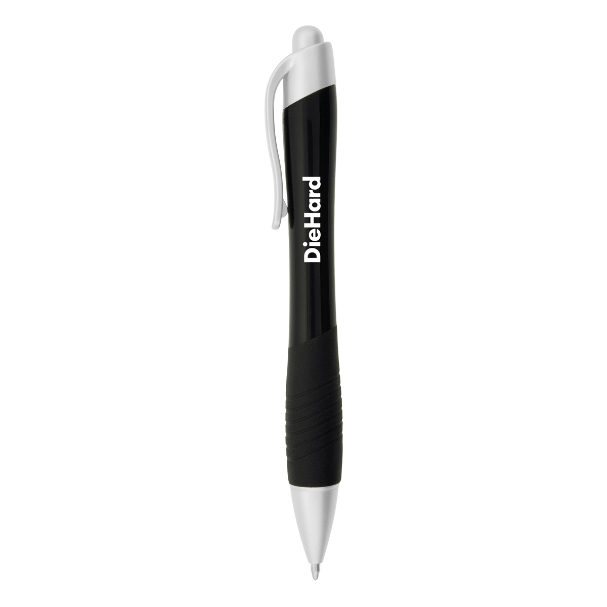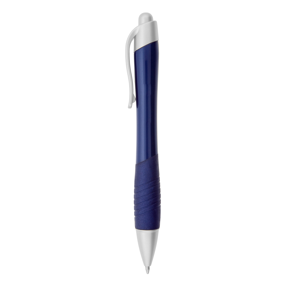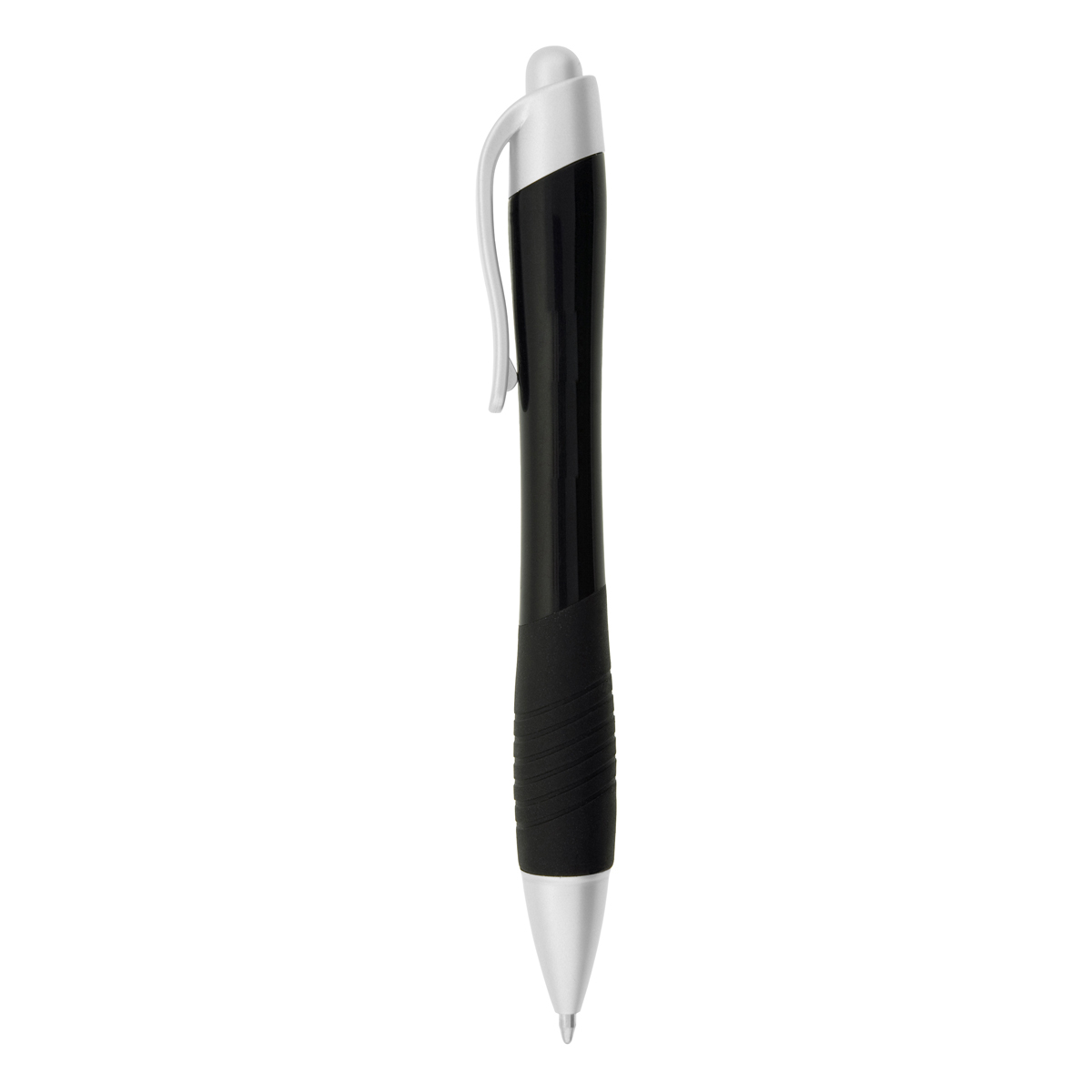 A plastic click action ballpoint pen with black ink, a soft grip and wavy design.