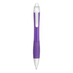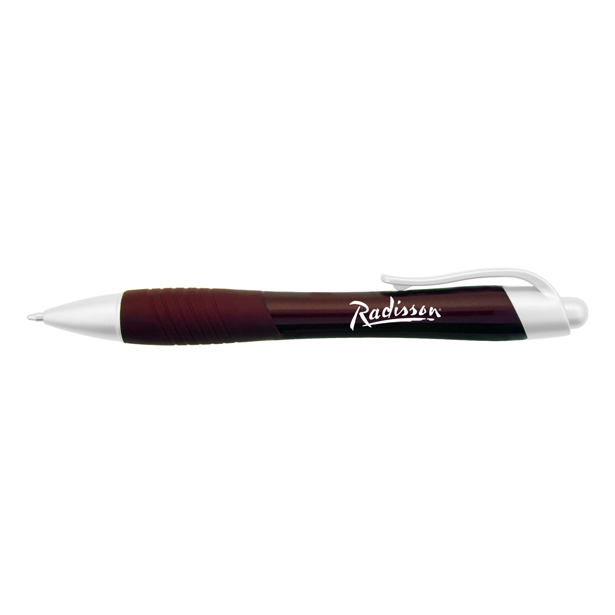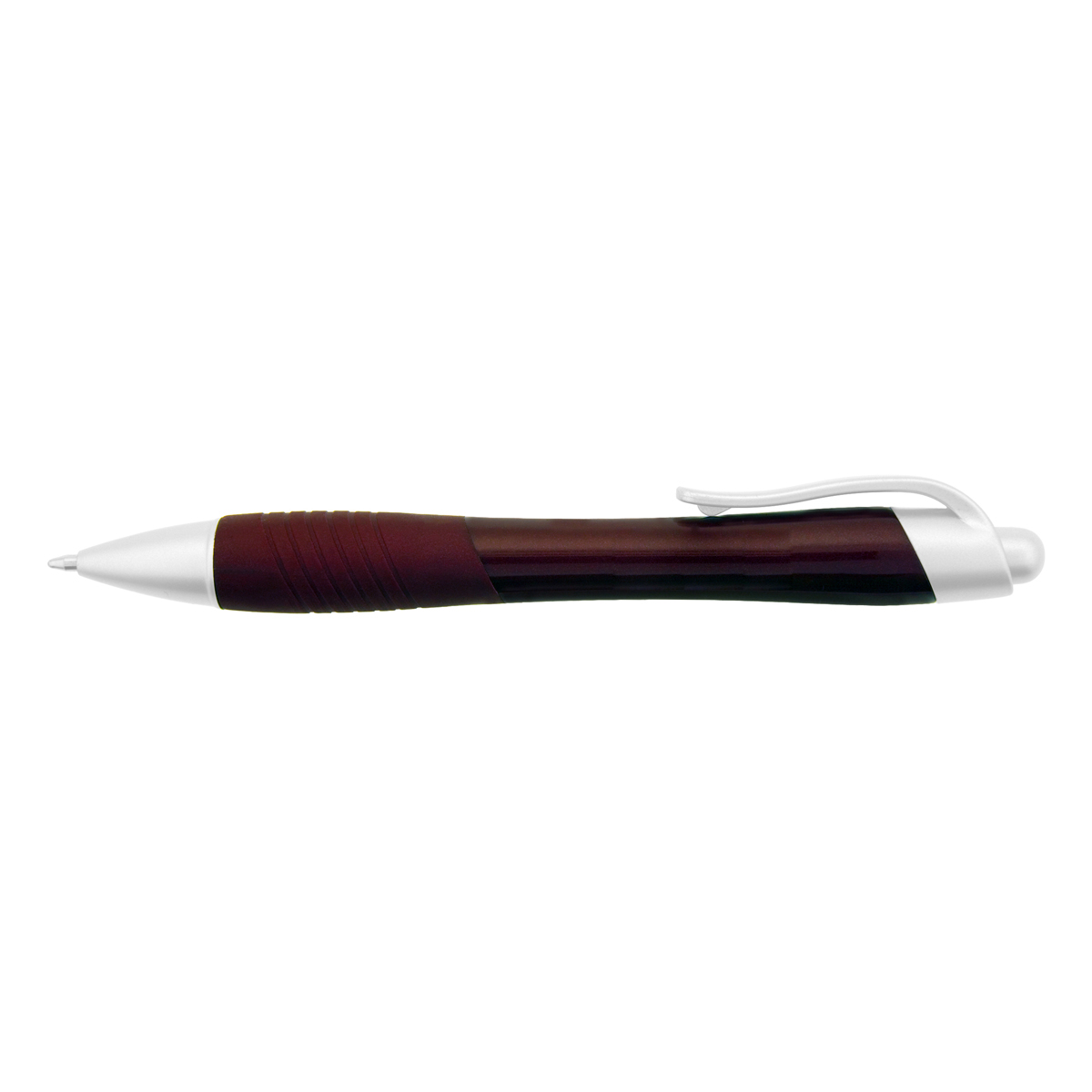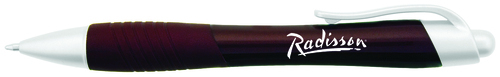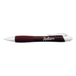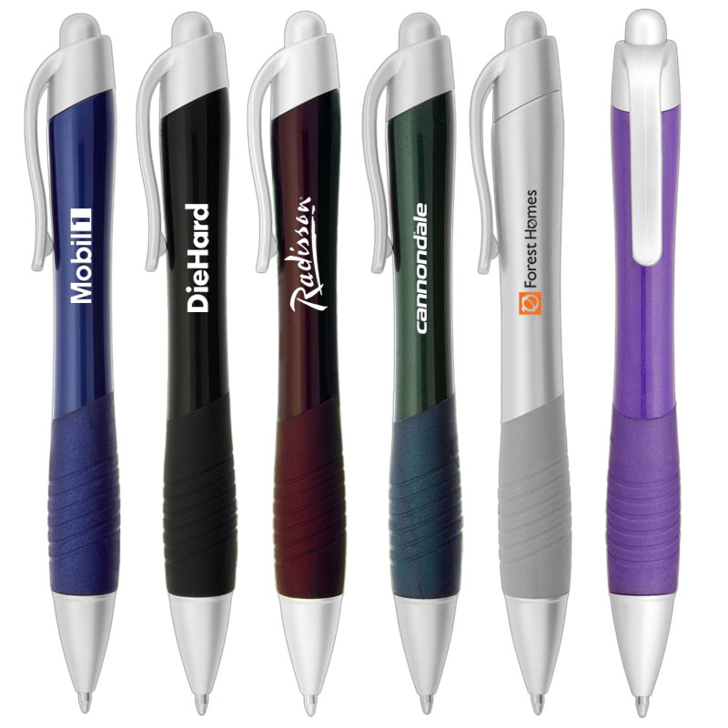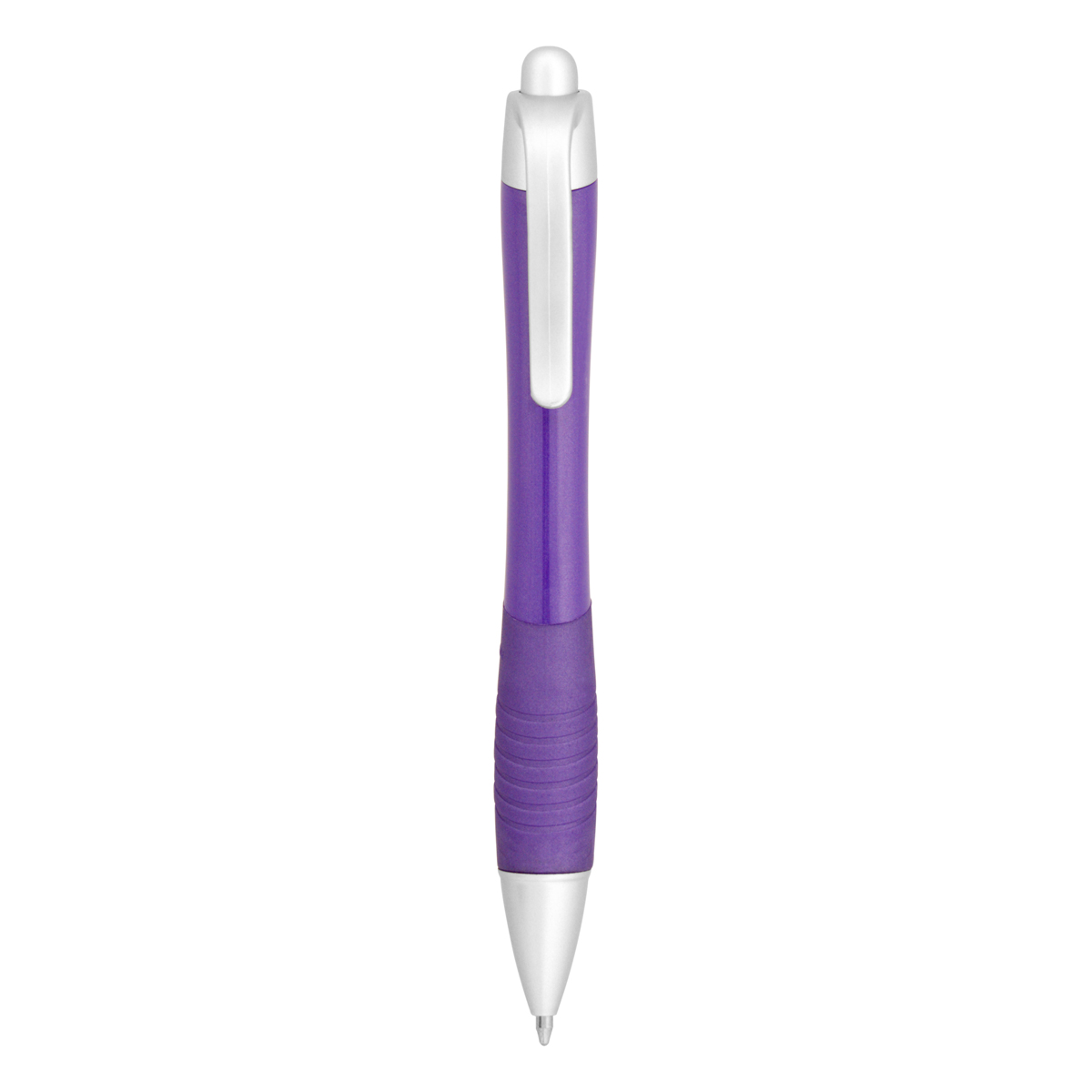 A plastic click action ballpoint pen with black ink, a soft grip and wavy design.