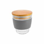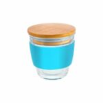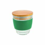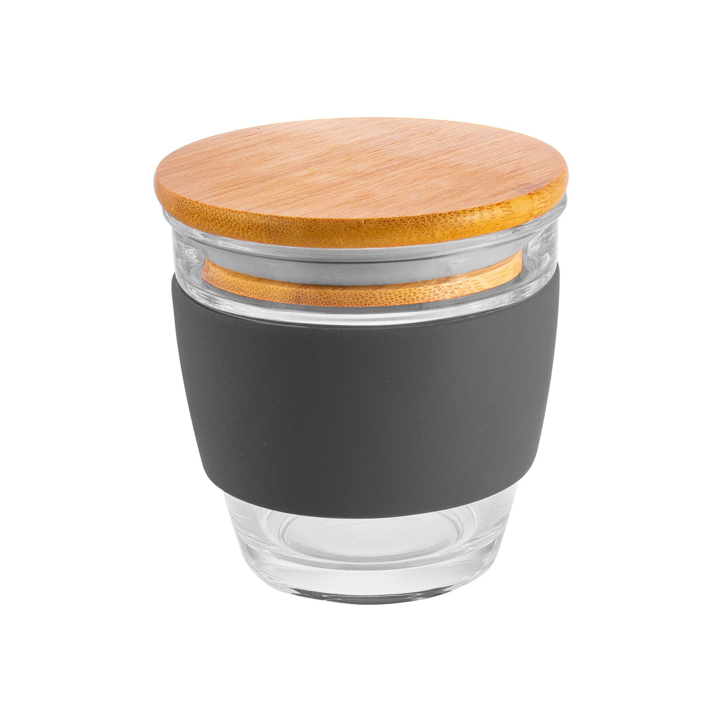 Milano 240ml Glass Cup with bamboo lid and band. Made from single walled borosilicate glass. Choose from a large range of colours for silicone bands. To maximise the life of the logo, we suggest cups are handwashed only