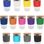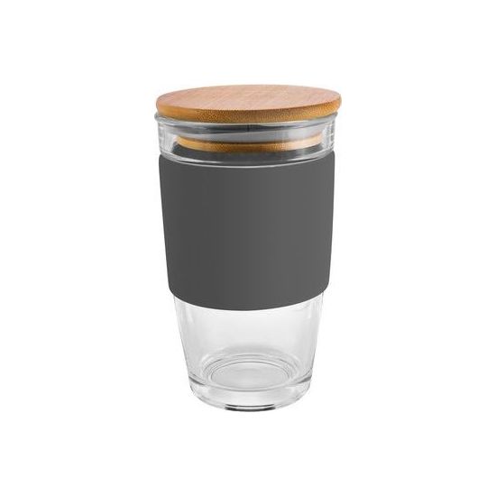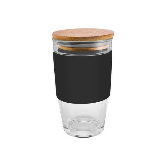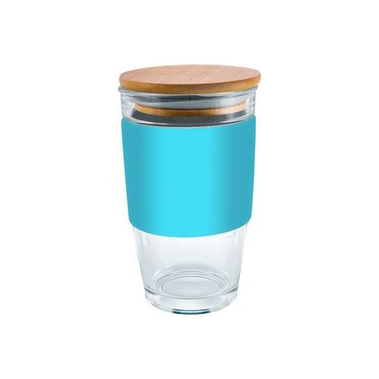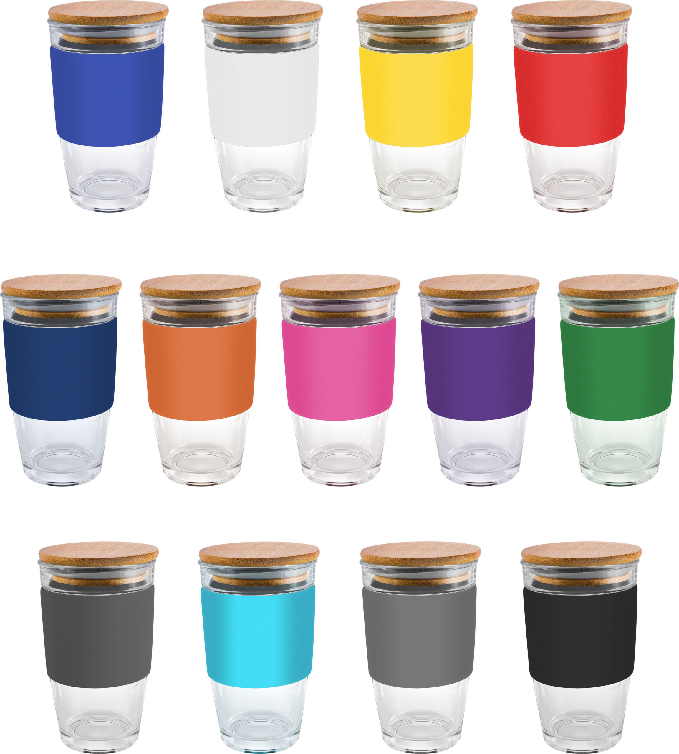 Milano 475ml Glass Cup with bamboo lid and band. Made from single walled borosilicate glass. Choose from a large range of colours for silicone bands. To maximise the life of the logo, we suggest cups are handwashed only