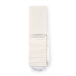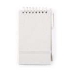 Spiral bound notebook made from recycled milk cartons. 70 leaves, 140 lined pages (70GSM) of paper. Has a white elastic retaining strap, pen loop as well as a white barrel cardboard push button pen with black ink.