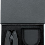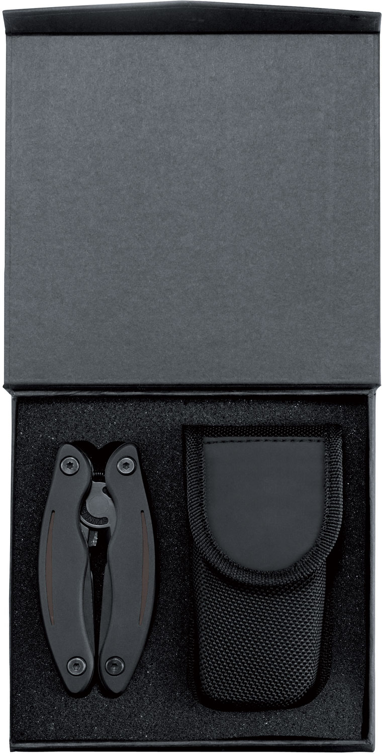15 function stainless steel multi tool with black coated anodized aluminium case and belt bouch. Packed in a black magnetic box.