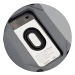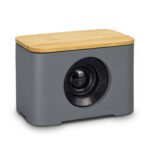 Stylish 5W Bluetooth speaker with limestone cement casing and a natural bamboo surface with built-in 5W wireless charging capability. The speaker has a 600mAh battery that will play music for up to four hours and recharges in five hours. Music can be played via Bluetooth or AUX input. Instructions and a Micro-B USB cable are included.