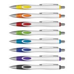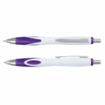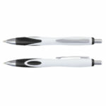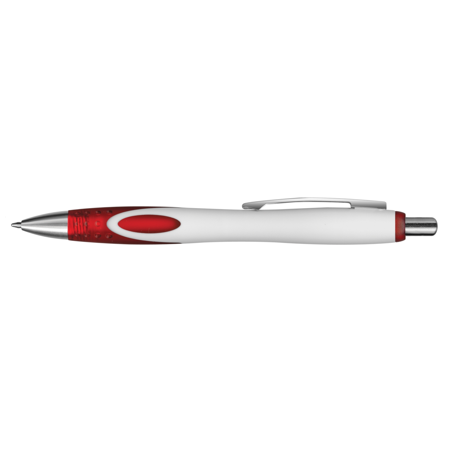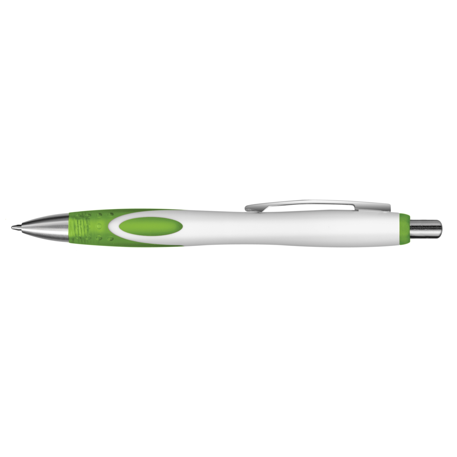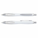 Retractable plastic and metal ball pen with a White barrel which features a unique frosted translucent double injected grip zone and shiny Chrome accents. Blue ink large volume refill with 1800 metres of German manufactured DOKUMENTAL ink and a tungsten carbide ball for improved writing quality. Black ink is available for an additional charge. Decoration options: Pad Print | Direct Digital