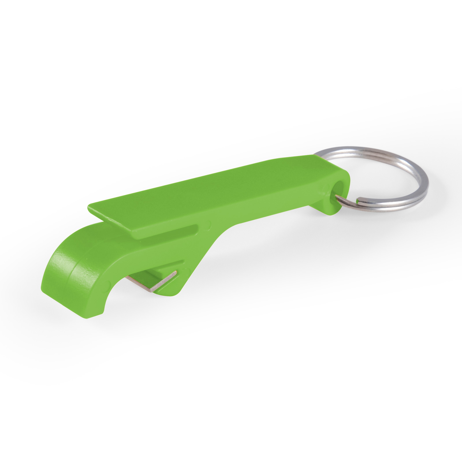 Plastic opener/keytag. Opens crown seal tops and ring pull can tops. Split ring 25mm diameter.