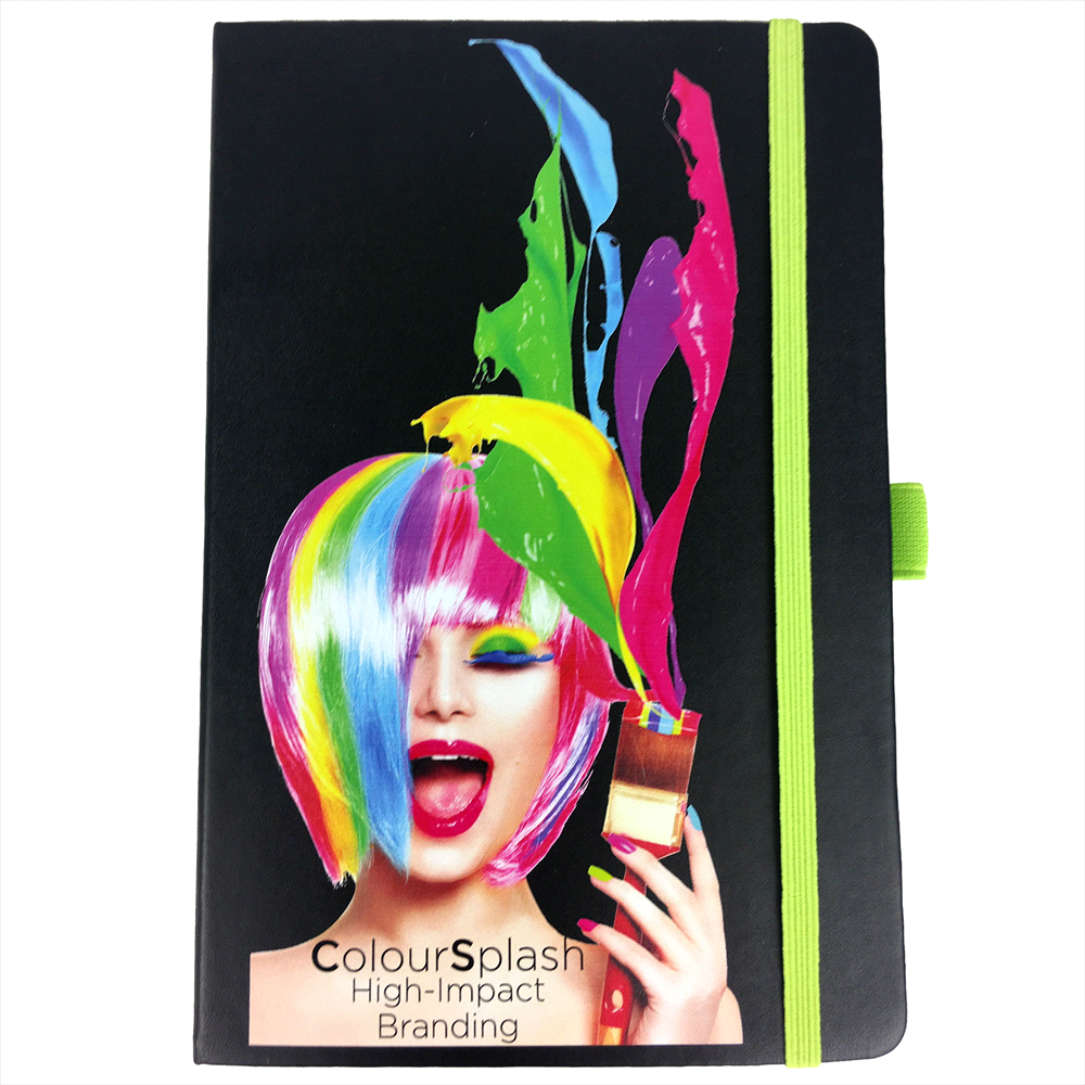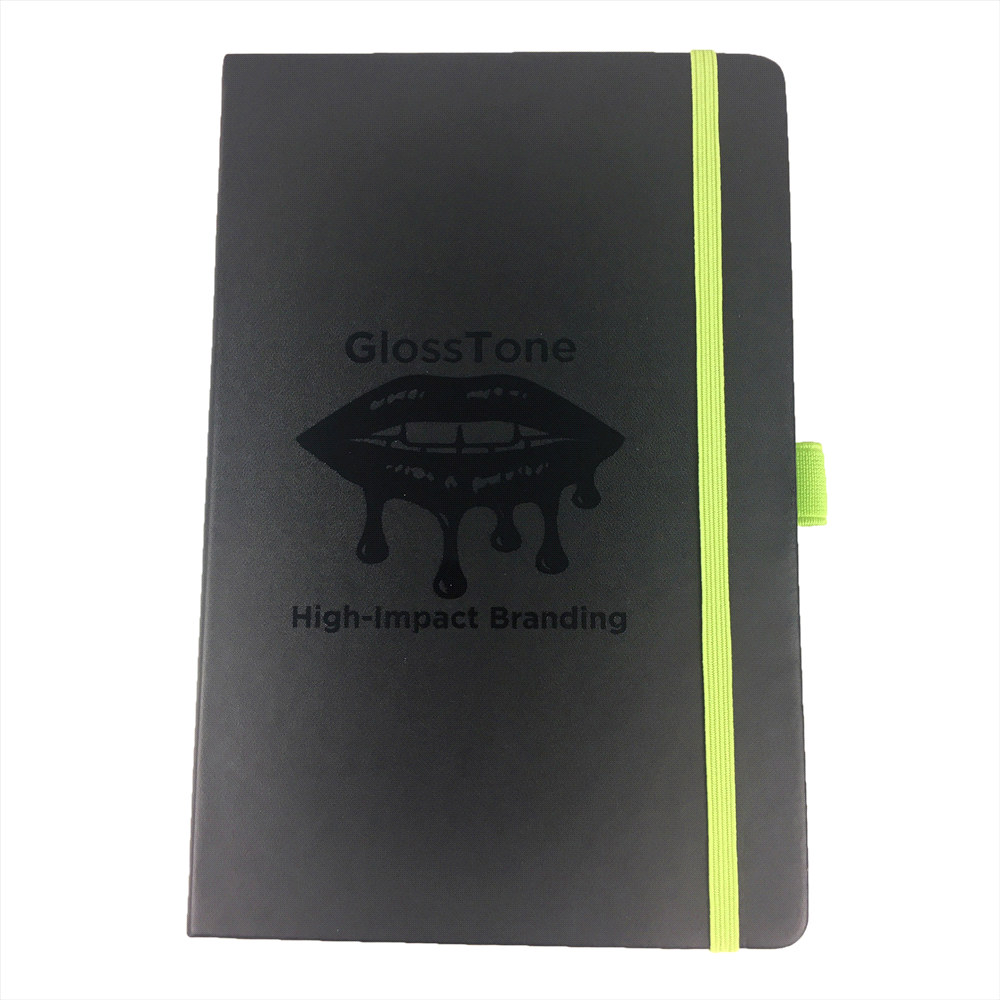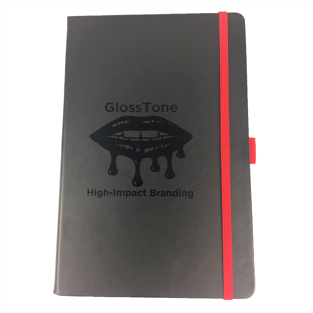 Faux leather like, hard cover bound journal with built in elastic closure. Colour accent painted edge paper, elastic pen loop and ribbon page marker. Back document pocket. Includes 96 sheets of white lined paper. Pen not included.