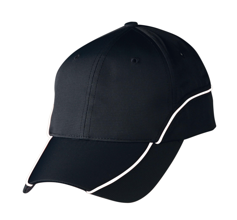 Fabric: Nylon Ripstop peak cap with polyester mesh lining Features: 6 panel structured laid back front Nylon ripstop with polyester mesh lining, contrast trim across peak & crown, short crossover velcro Matching Style: JK21 track suit