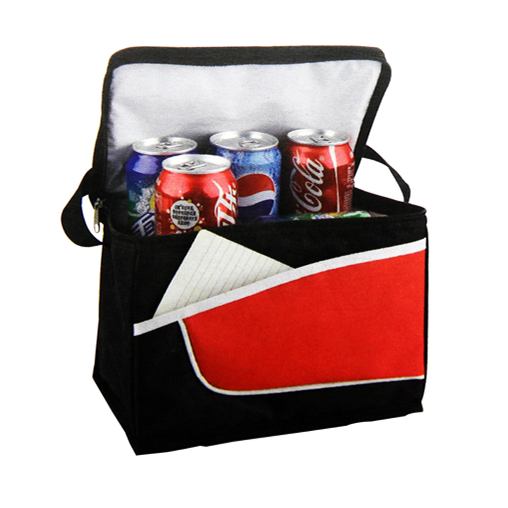 Made of 600D Nylon. Complete PE foam insulation. Black bag with Coloured front pouch, handy for small personal items.. Short handles