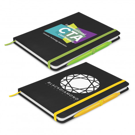 Smart medium size notebook with 80 lined leaves, a book mark ribbon, an elastic closure band and a pen loop. It has a hard cover with a luxury soft touch Neoskin finish and a matching plastic Omega pen is included in the pen loop. (Please note that the pen and notebook are matched as closely as the materials allow). . Decoration options: Pad Print | Screen Print | Direct Digital | Debossing