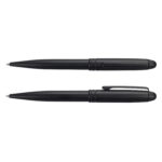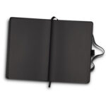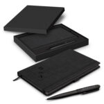 Luxurious notebook and pen gift set with matte black theme, beautifully presented in a black gift box. The hard cover notebook has 80 leaves (160 pages) of unique black 110gsm unlined paper, a thermo PU cover, an elastic closure and a bookmark ribbon. The metal twist-action ballpoint pen has a lacquered matte black barrel, metal trim and 130m of silver gel ink. The Onyx Writing set also includes three spare pen refills.