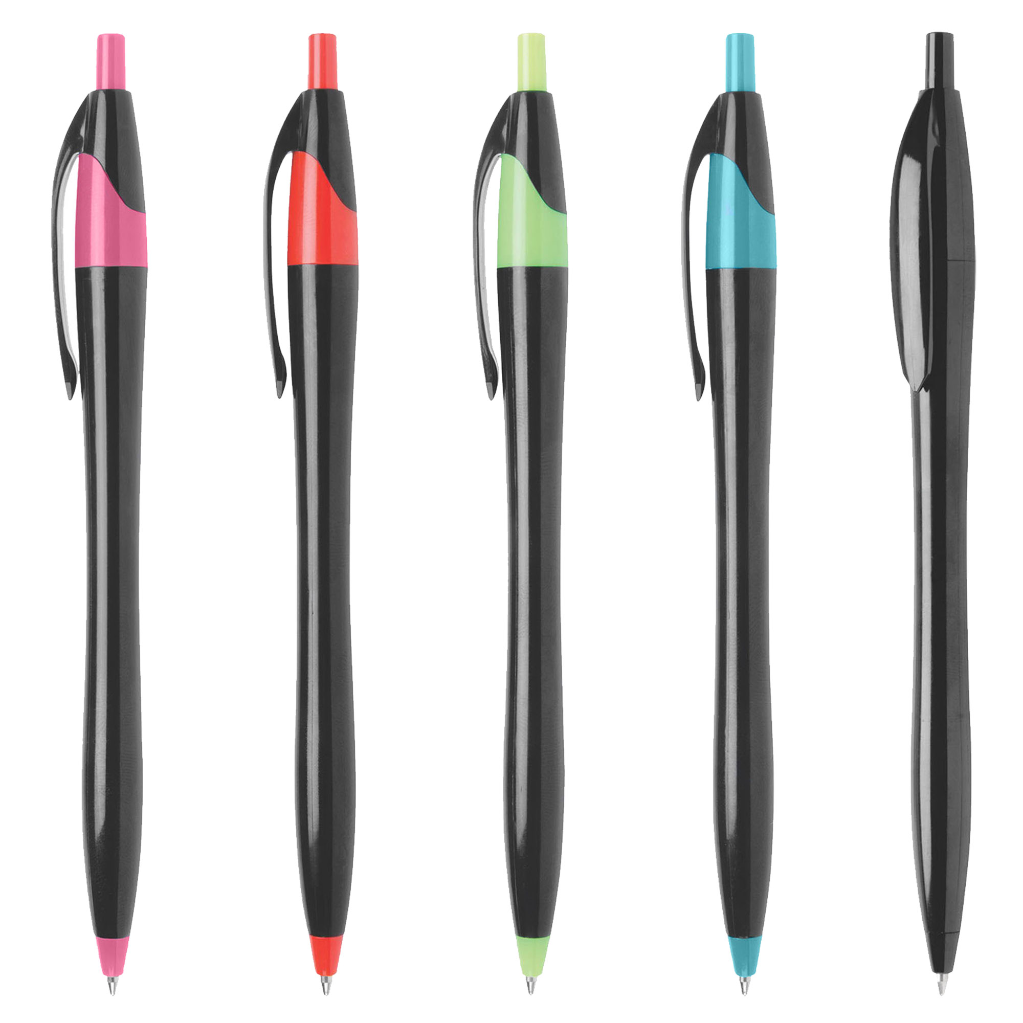 One of the most popular slim stylish plastic pen in promotions. Retractable pen with popular contoured design, high quality, affordable and a great solution for your next tradeshow, office re-supply or give away. Black barrel with coloured push button, neck, and tip. Cross-type German manufactured black ink and tungsten carbide ball which brings you the better writing quality, 1200 meters writing distance.