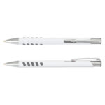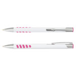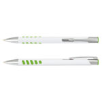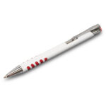 Retractable aluminium ballpoint pen with a painted gloss white barrel, shiny chrome accents and a coloured silicone grip with matching end cap. It has a large volume refill with 1200 metres of black German manufactured Dokumental ink. Panama can be presented in an optional pen sleeve or a gift box.