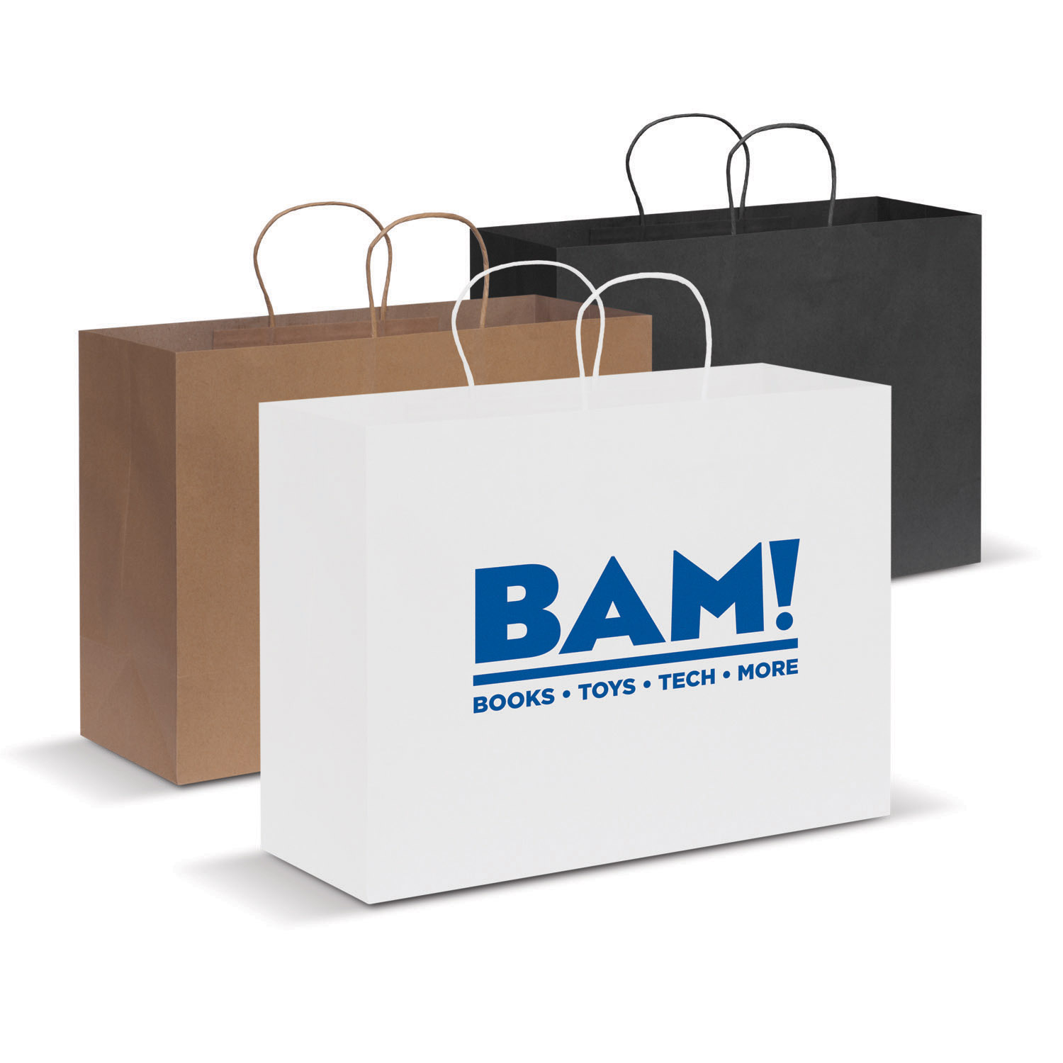 Extra large carry bag made from tough 160gsm paper. The Natural and Black colours are recycled paper. . Decoration options: Screen Print