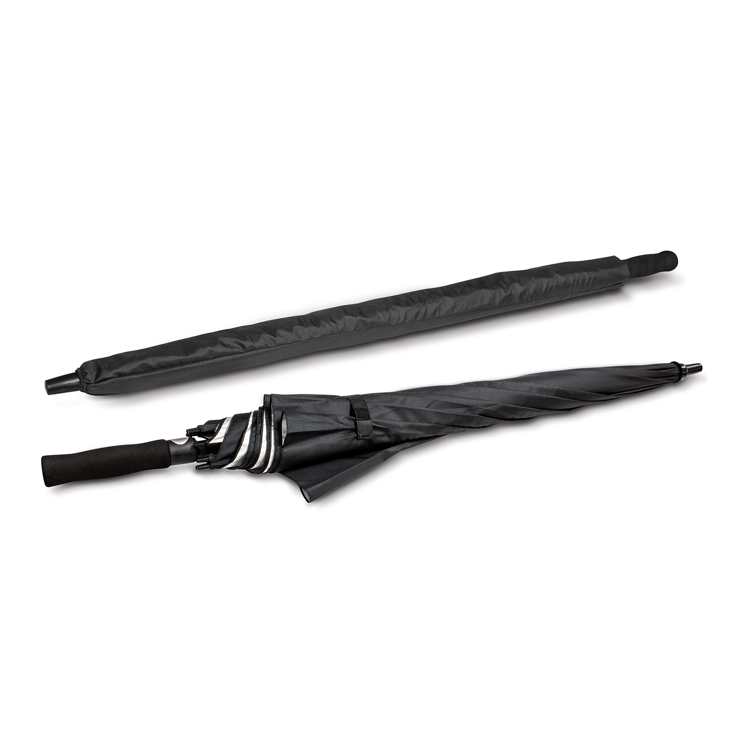 Premium eight-panel sports umbrella which has a strong 190T pongee canopy with a smart silver finish on the underside. It has automatic opening and a windproof fibreglass frame with 76cm ribs. Other features include a fibreglass shaft with a soft EVA hand grip, tough polypropylene tips, a Velcro tie and a matching pongee sleeve.