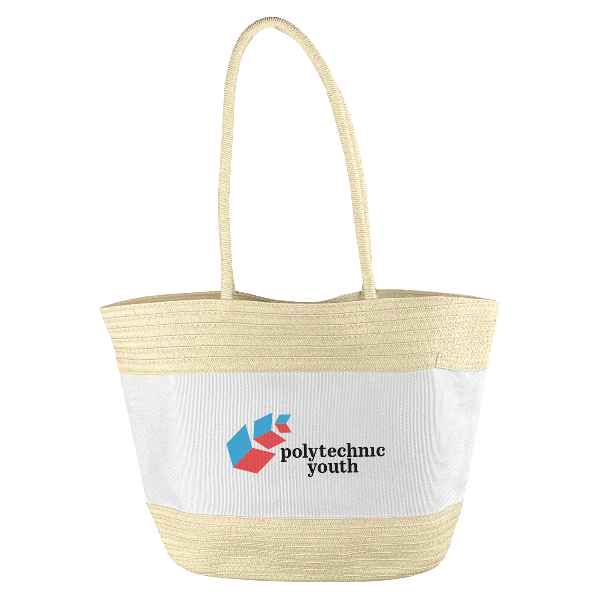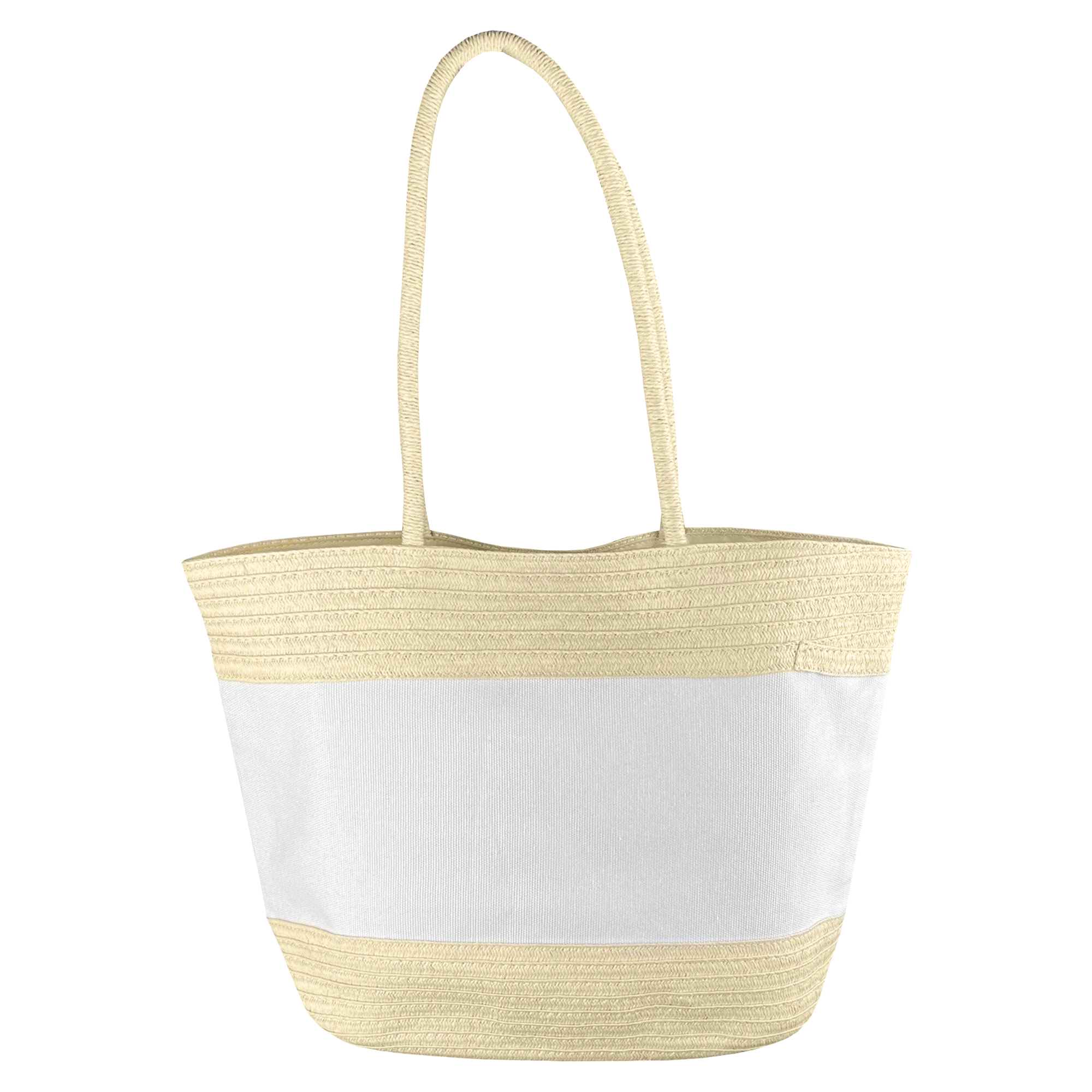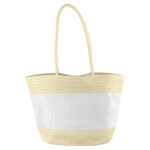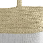 Blend mixture of kraft paper and poly-canvas in the middle of the bag. 100% polyester inside lining and small pouch featuring a magnetic top button closure and shoulder length kraft paper wrapped rope carry handles which can hold up to 5kg of weight. Stylish and large enough for both work and lifestyle.