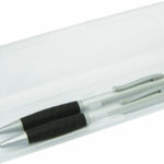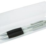 Slim line aluminium pen and pencil set. Push button style with contrasting black grip, packed in a clear plastic box.