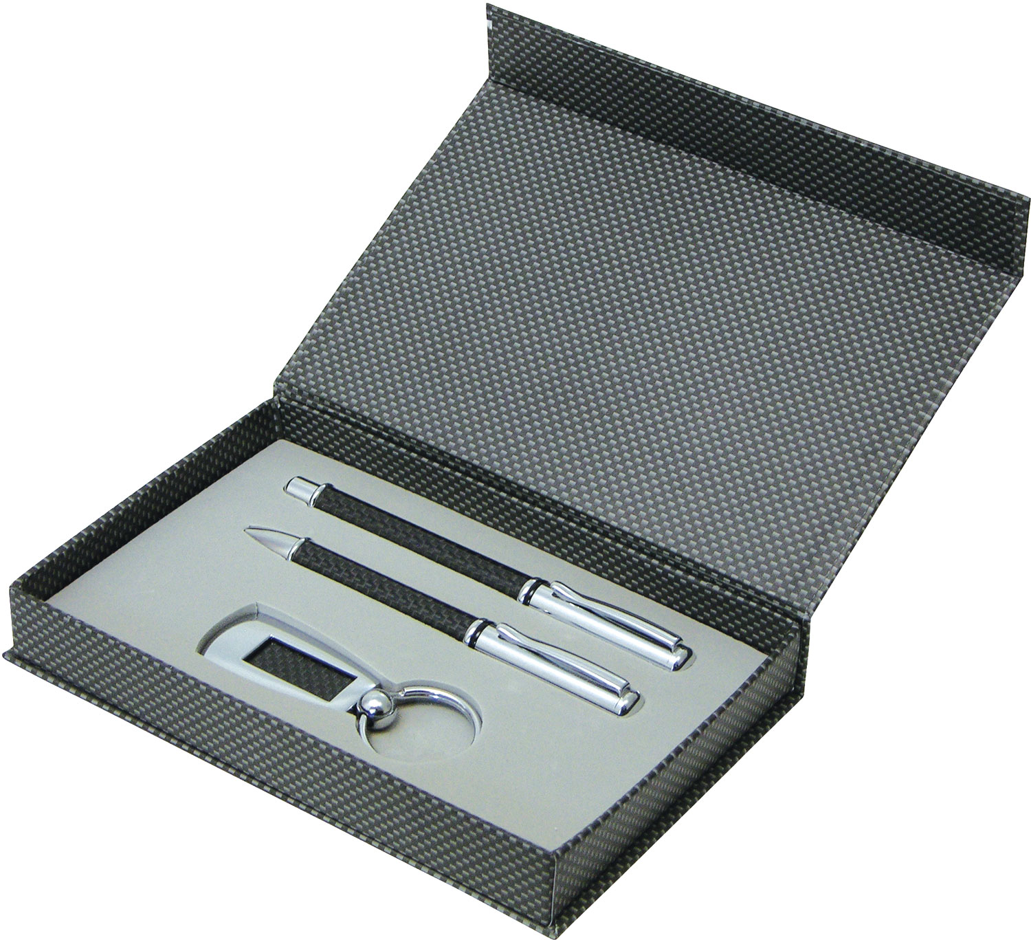 Executive gift set with a carbon fibre ball point and roller ball pen and matching keyring packed in a magnetic gift box. The pens each have a carbon fibre barrel and silver fittings, the rollerball with a silver cap. The keyring has a carbon fibre inlay and silver surrounds. Parker style black refill.