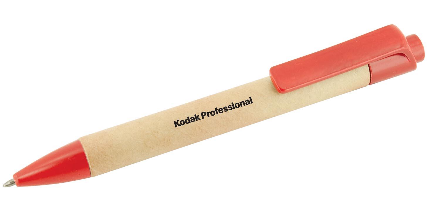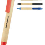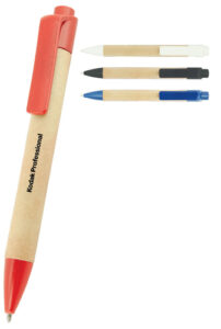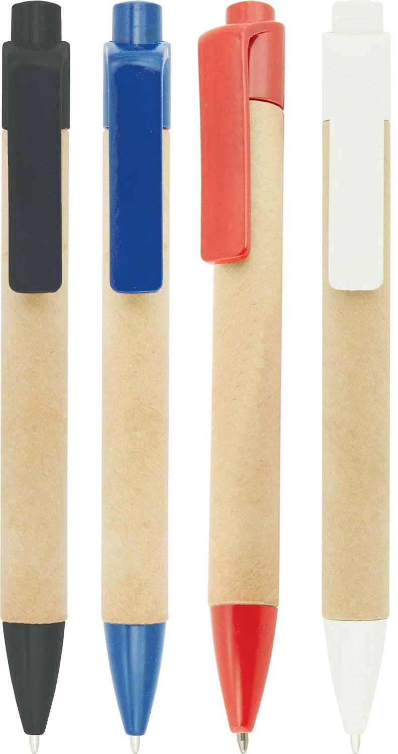 Eco friendly push action pen with recycled cardboard barrel and contrasting coloured plastic fittings made from recycled materials. Parker style black refill.