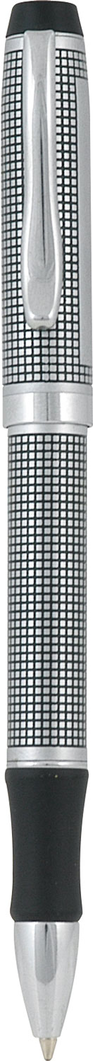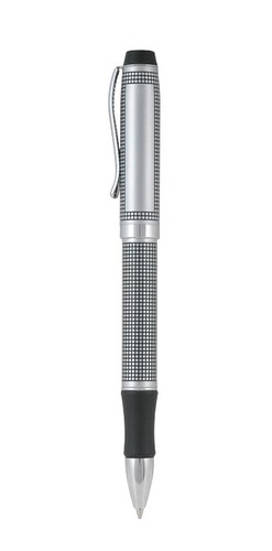 Unique and stylish twist action ball pen with grid design, ergonomic grip and built in area for branding. Parker style black refill.
