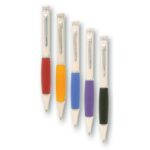 Stylish twist action silver metal pen with a rubber grip in contrasting colours and shiny silver fittings. Parker style black refill.