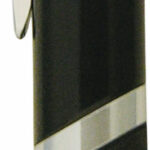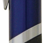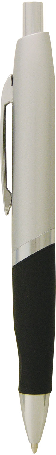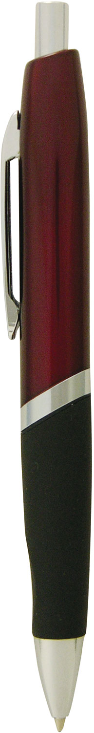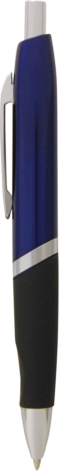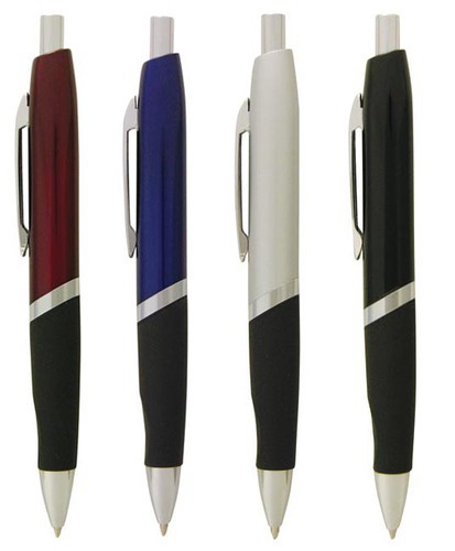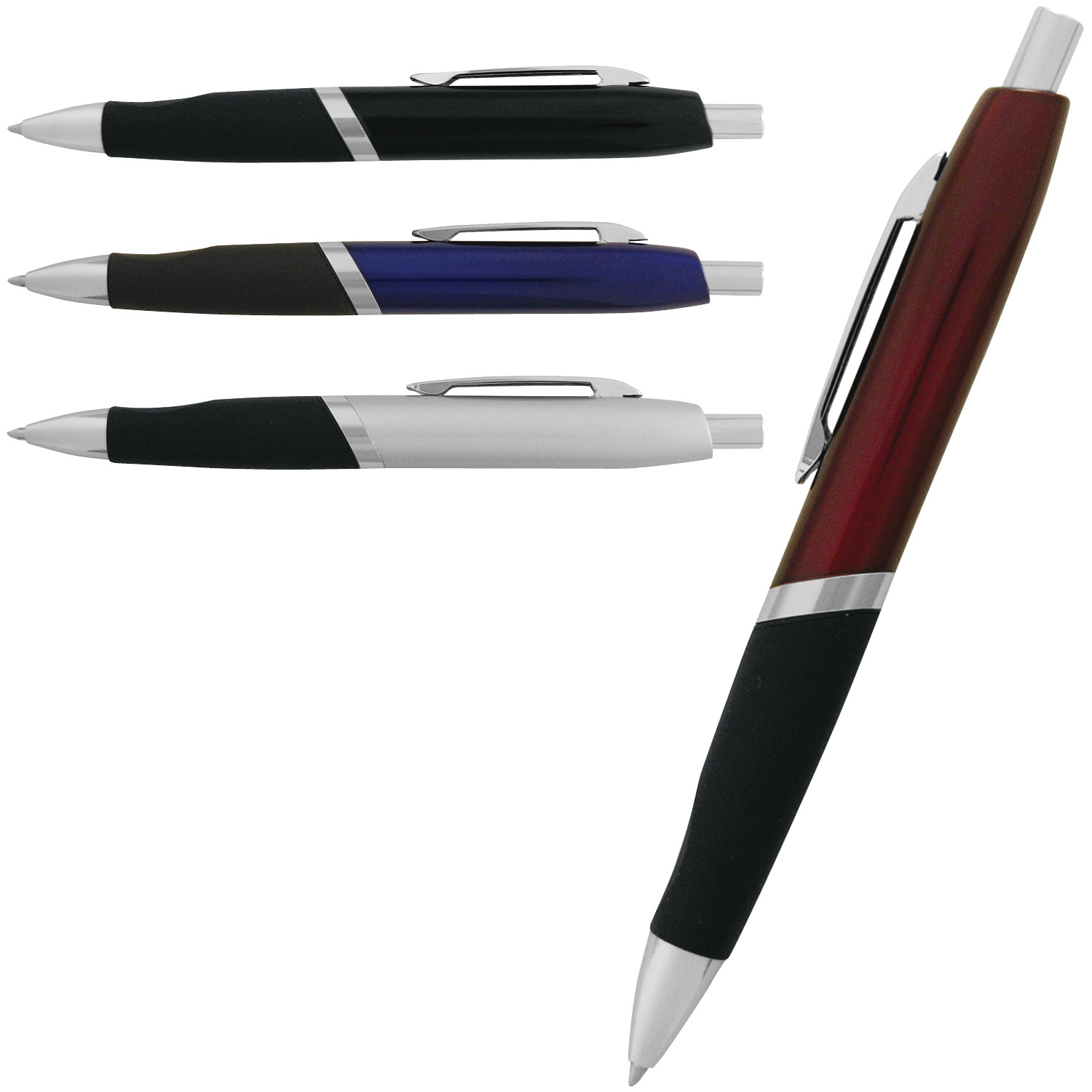 This push button metal pen has a coloured barrel with black rubber grip and silver fittings. Parker style black refill.