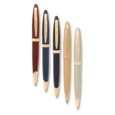 Elegantly styled classic twist action metal ball pen with shiny gold fittings. Parker style black refill.