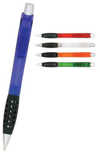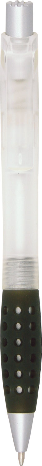 Push action plastic pen with frosted barrel and textured black rubber grip. The apollo has a silver tip and trim and comes with a Parker style black refill.
