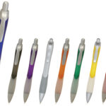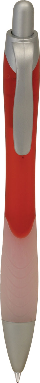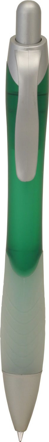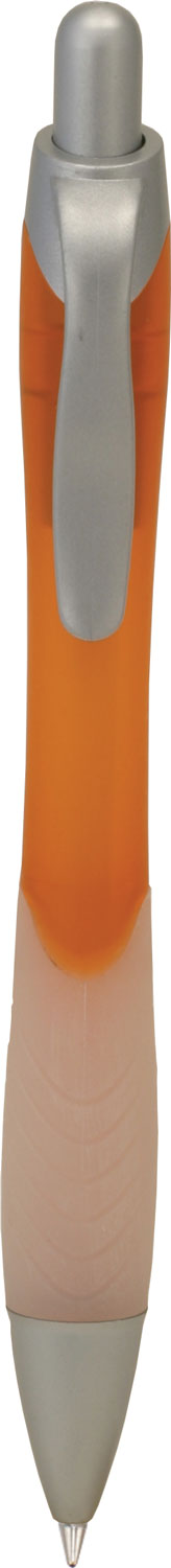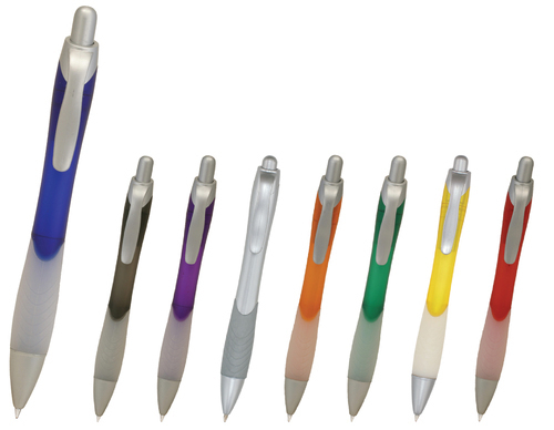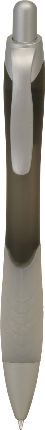Push action plastic ball point pen with a frosted barrel and contoured rubber grip. The Pen has a satin chrome clip, tip and trim and comes with a black Parker style refill.