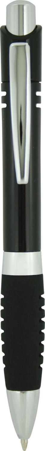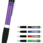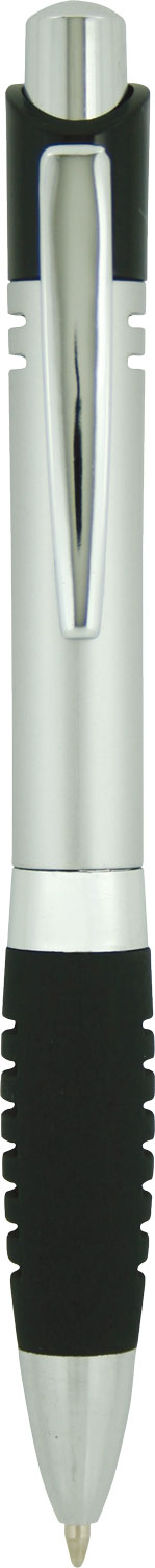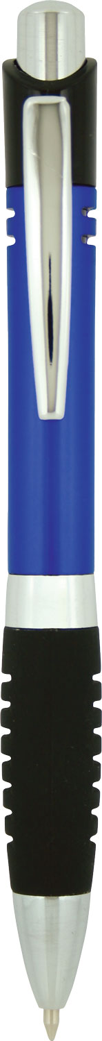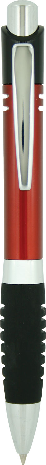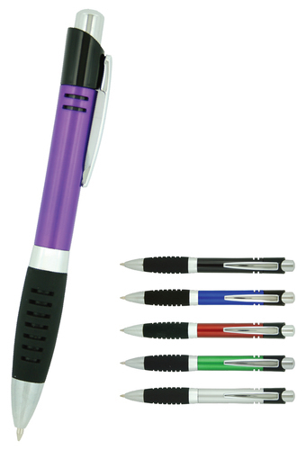 Push action contemporary design plastic pen with metallic finish on the coloured barrel, along with a black rubber grip, silver clip, tip and trim. Parker style black refill.