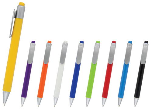 Push button plastic ballpoint pen with a coloured matt finish barrel. The sleek design is complimented by matt silver clip with generous branding area and silver tip. Parker style black refill.