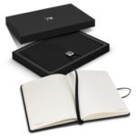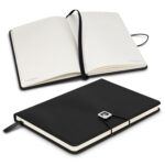 Quality notebook presented in a stylish giftbox. The notebook that has 80 leaves of cream lined 80gsm paper, with a thermo PU cover and an elastic band closure with a branded metal slider.