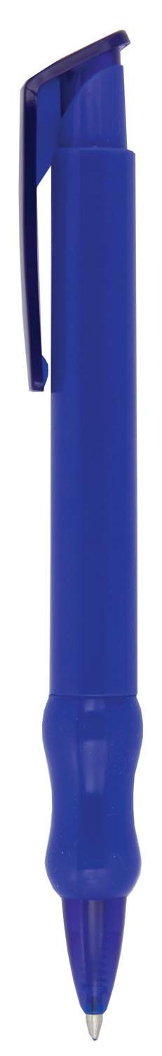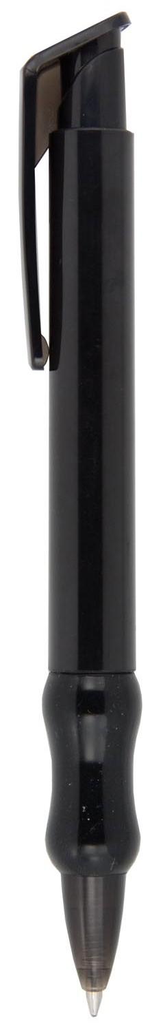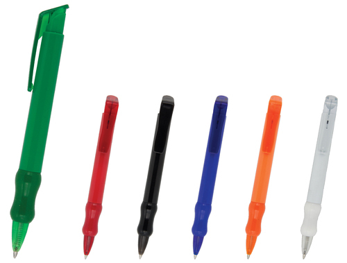 Push action plastic pen with solid coloured barrel, translucent trim and curved coloured grip. Parker style black refill.