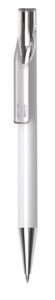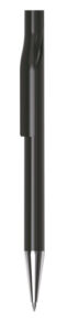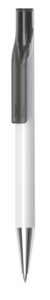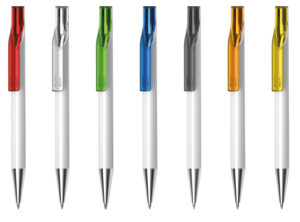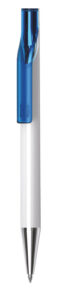 European designed push action plastic pen with choice of solid white barrel and translucent coloured clip, or solid black or white barrel with frosted clip. Both with chrome tip
