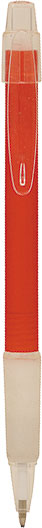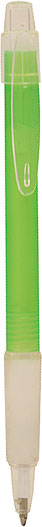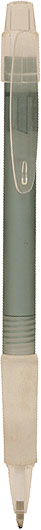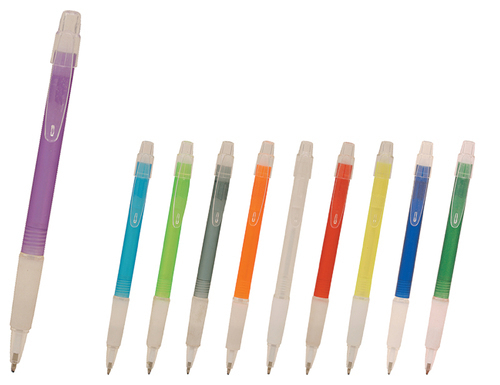 Slim line push action palstic ball point pen with a frosted barrel, white rubber grip and clear plastic clip. Parker style black refill.