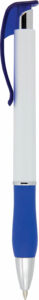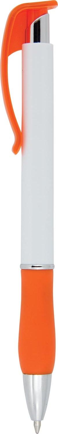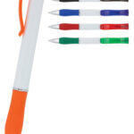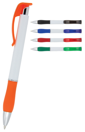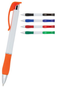 Fashionable push action plastic ball pen with white barrel, curved coloured clip and ergonomic grip. Parker style black refill.
