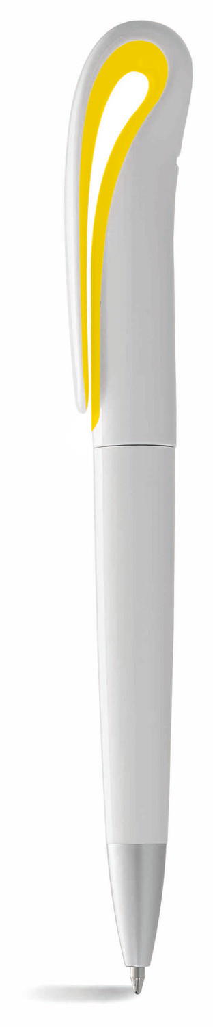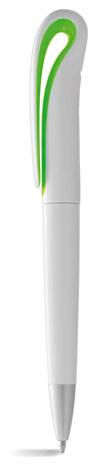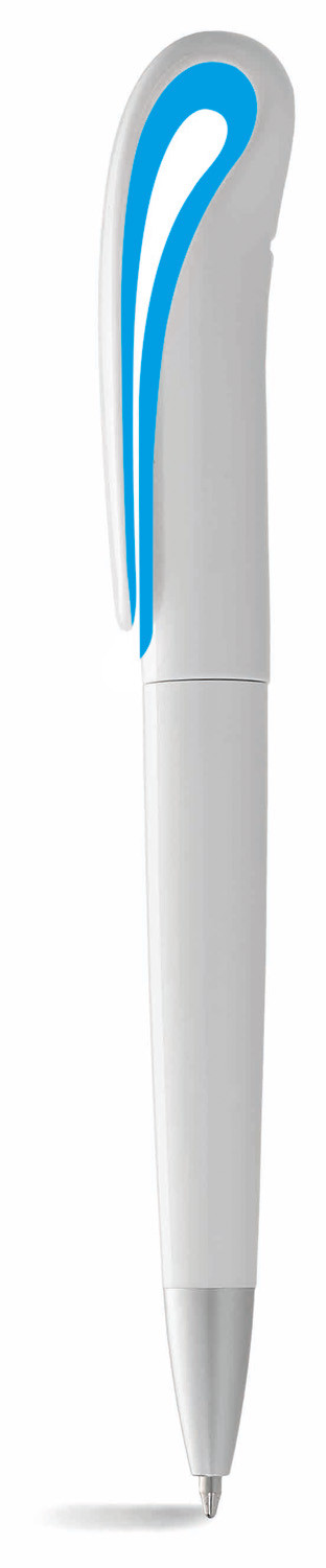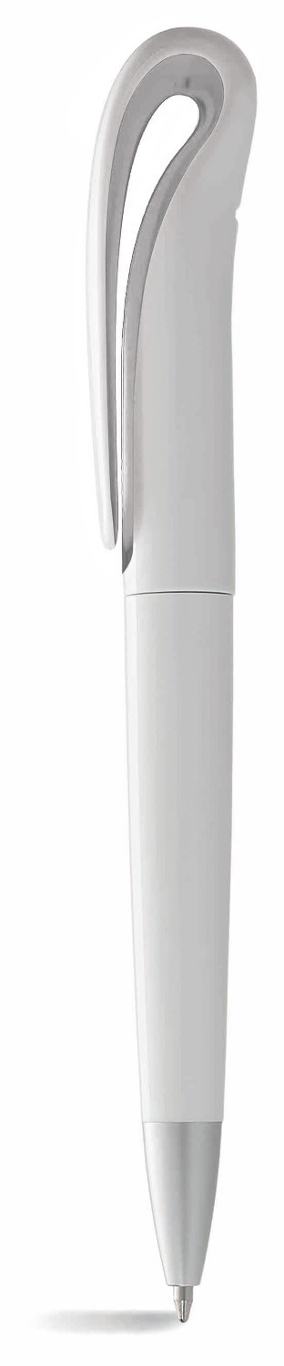 Twist action ballpoint pen with styled clip. White barrel with contrasting colour under the clip and silver tip. Also available in style P2006 with a coloured barrel.