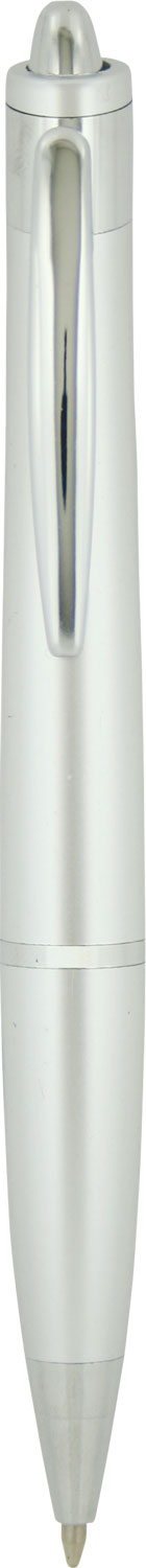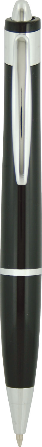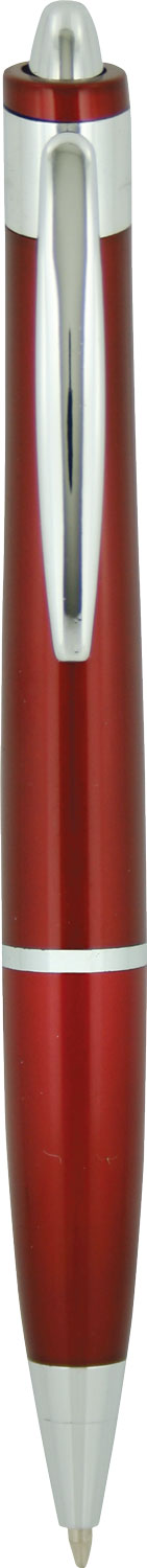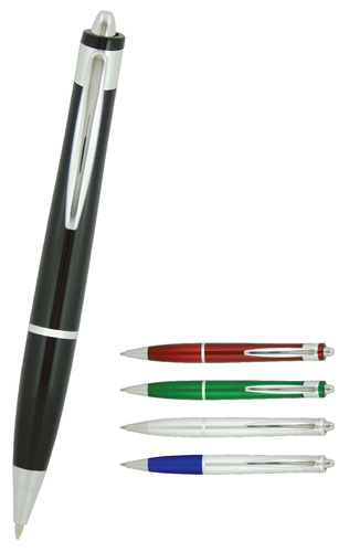 Modern push action plastic pen with coloured barrel, metal clip and silver fittings. Parker style black refill.