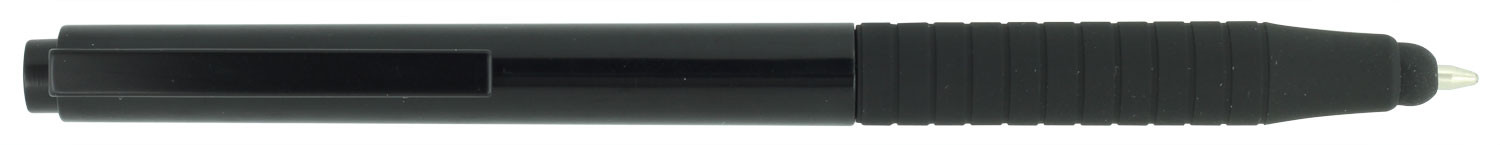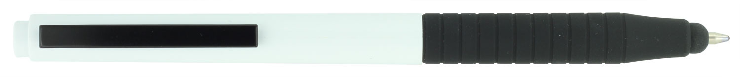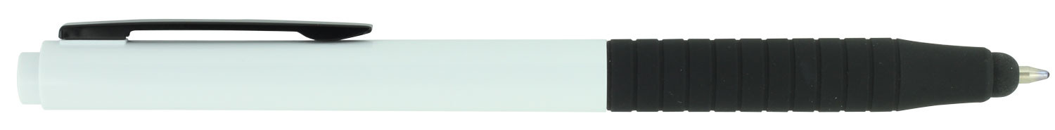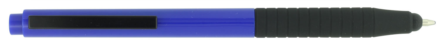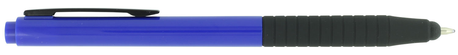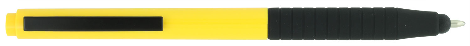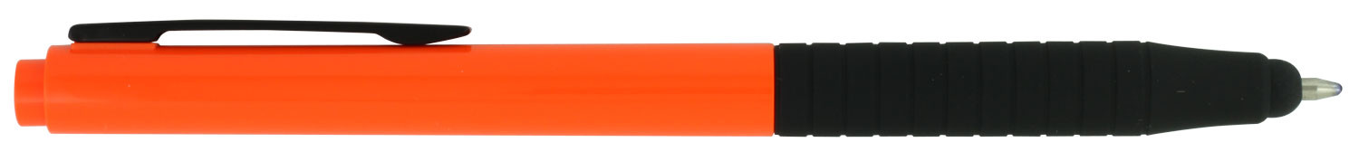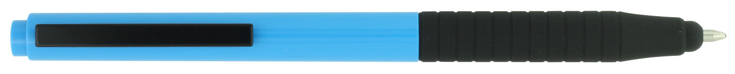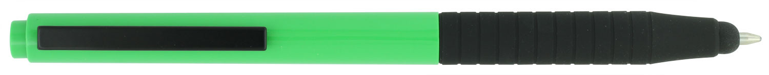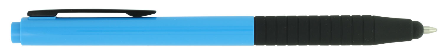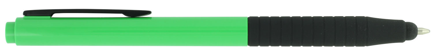 Push action slim plastic pen which doubles as a touch screen stylus. It has a vibrantly coloured barrel with a black metal clip and black rubber grip. Black ink.