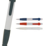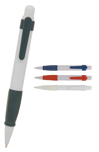 This push action plastic pen is avaialble in a choice of solid white barrel with coloured trim and grip or translucent barrel with coloured grip. It has a large branding area and Parker style black refill.
