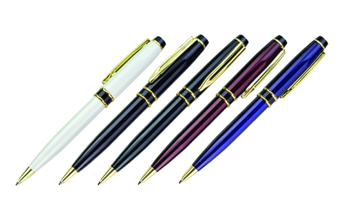 Twist action pen. Coloured Barrel with Gold Fittings. Metal Parker-Type black ink refill