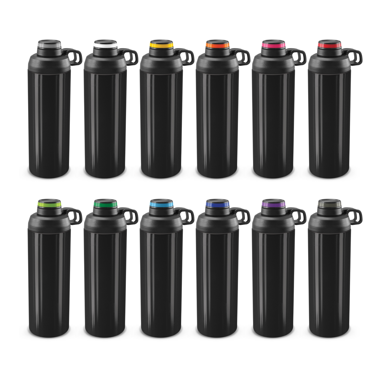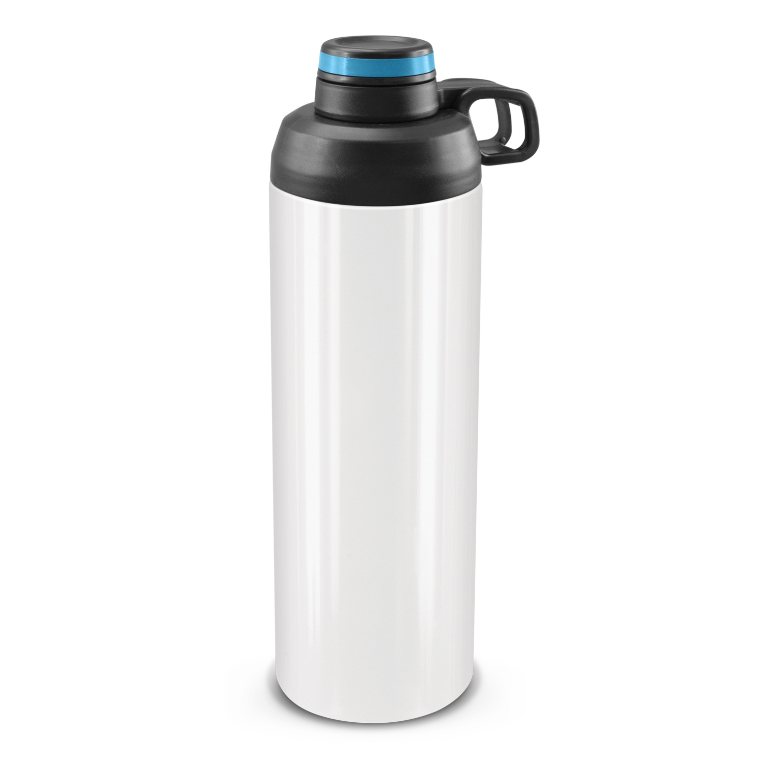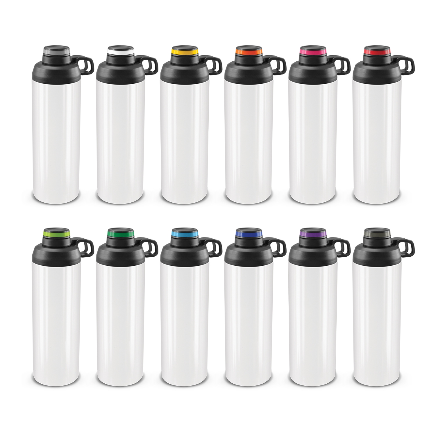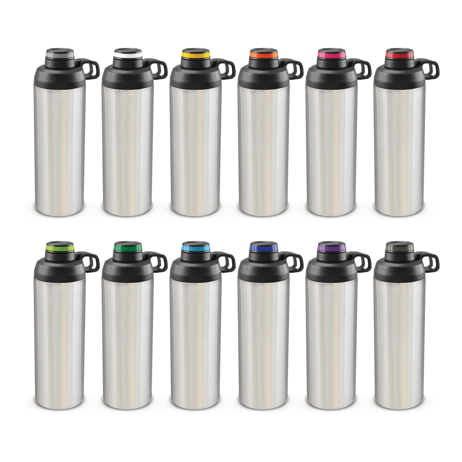 Large 900ml stainless steel drink bottle which features a secure screw on lid with a carry handle. The lid also features a silicone outer ring for improved grip and the option of adding a smart full colour resin coated logo on the top. Primo has an extra large bottle opening which is ideal for adding ice cubes. Eco Safe: Stainless steel does not require a plastic liner ensuring a chemical and odour free beverage. It has an indefinite lifespan which keeps your logo in the public arena for longer and also helps to limit the use of disposable plastic bottles that can end up polluting the environment. All materials used are recyclable and BPA free. . Decoration options: Pad Print |Screen Print | Resin Coated Finish | Laser Engraving