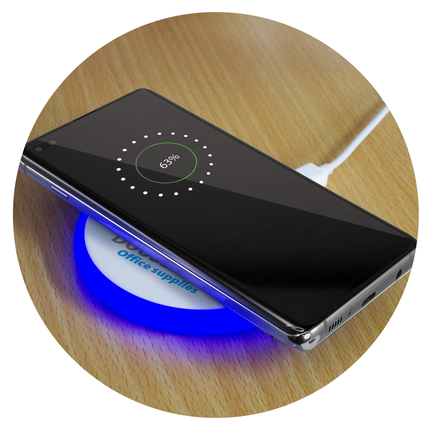 5 Watt round wireless phone charger that produces an attention grabbing light show of varying intensity when the unit is charging. It is compatible with devices that are enabled for QI wireless charging and will charge most modern phones including iPhone 8 upwards, Samsung Galaxy S6 upwards and many more. Simply plug it into any USB port or a mains adapter and place a compatible device on it for convenient wireless charging. It is supplied with an 80cm Micro-B USB cable and an instruction leaflet.