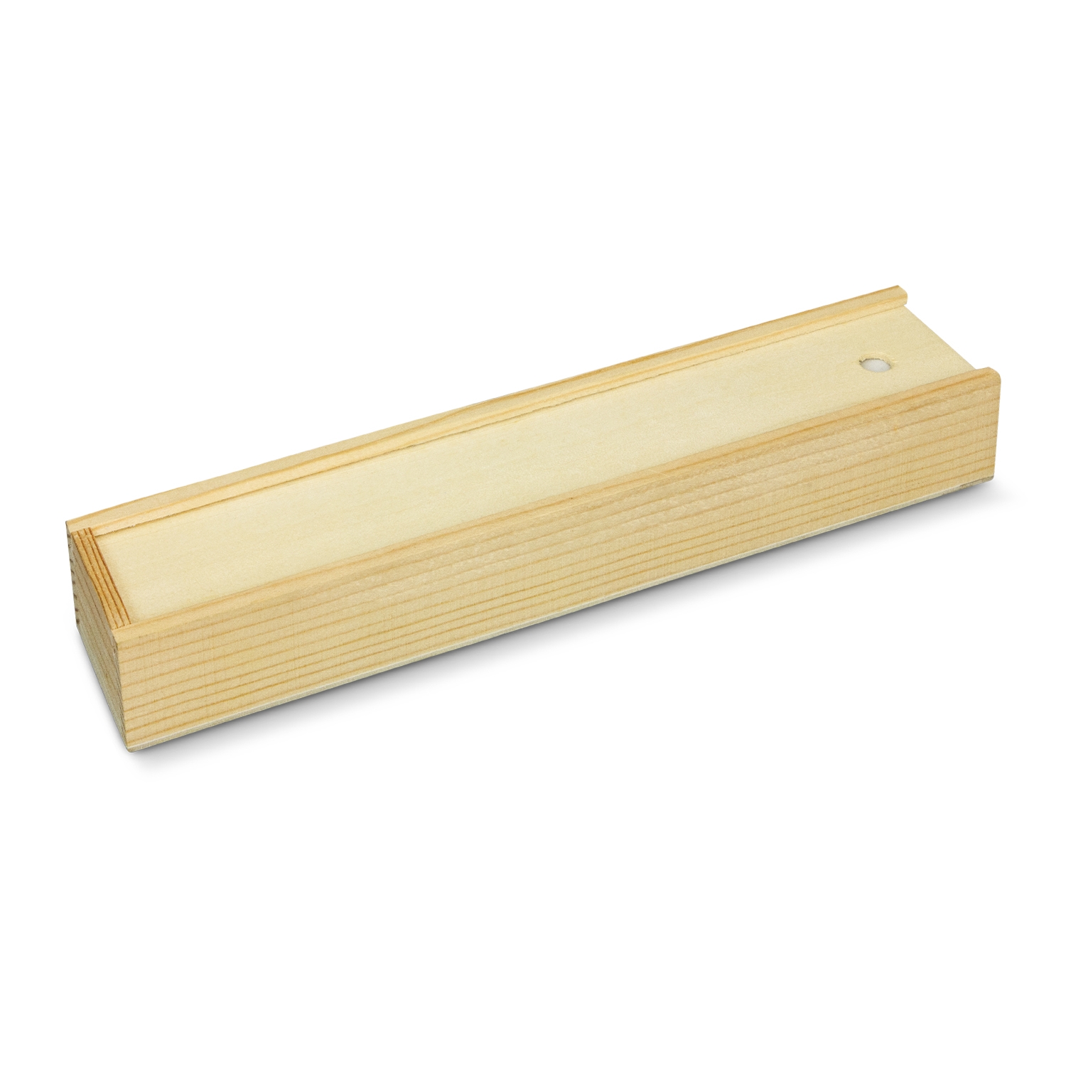 Set of eight unpainted wood colouring in pencils, a pencil sharpener and an eraser in a natural wood box. The box has a sliding lid which doubles as a ruler with metric and imperial graduations. Wood is a natural material which produces unavoidable variances in the grain pattern, colour and branding.